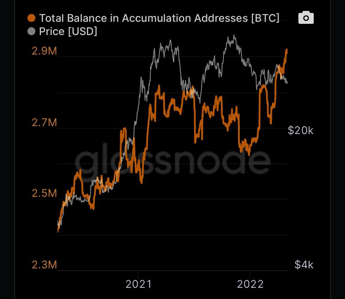 Địa chỉ tích lũy được định nghĩa là địa chỉ có ít nhất 2 lần chuyển tiền đến và chưa bao giờ tiêu tiền. Từ đầu năm 2022 đến nay dù giá có lúc giảm về gần 33,000 USD, nhưng lượng địa chỉ tích lũy này đã tăng liên tục đến mức lập ATH.