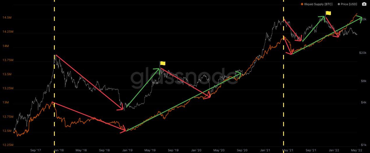 - Bây giờ, hãy để ý từ chỗ đánh dấu lá cờ màu vàng trên biểu đồ. Giá Bitcoin giảm nhưng lượng nguồn cung kém thanh khoản không giảm, thậm chí tăng mạnh. Sự phân kỳ này cho thấy kỳ vọng của các nhà đầu tư vẫn lạc quan bất kể giá Bitcoin chưa đáp ứng kỳ vọng đó của họ, thậm chí ngược kỳ vọng của họ.
