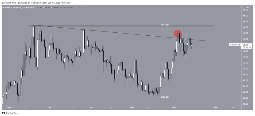 ATOM đã hoạt động dưới đường kháng cự giảm dần kể từ ngày 20 tháng 9. Khi đó, ATOM đạt mức giá cao nhất mọi thời đại là 44.8 USD. Mặc dù ban đầu có vẻ như mã thông báo đã đột phá giá vào ngày 6 tháng 1. Nhưng mã thông báo đã giảm trở lại và tạo thành thanh nến búa ngược. Từ đó, ATOM xác nhận tại kháng cự được chiếu từ 20/09.