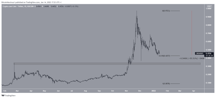 Tuy nhiên, CRO đang giao dịch ngay trên vùng hỗ trợ 0.42 USD, trùng mức hỗ trợ thoái lui Fibo 0.618. Mức hỗ trợ ngang tiếp theo là 0.32 USD. Vào đầu tháng 10/2021, CRO đã đột phát khói vùng hỗ trợ này và tiếp tục tăng lên mức ATH.