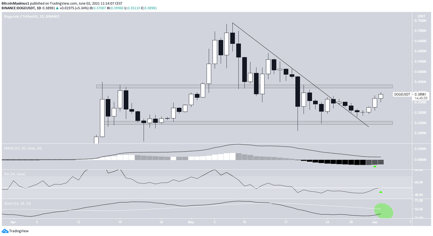 Vào ngày 25 tháng 5, tiền điện tử này đã đột phá lên trên đường kháng cự giảm dần. Một vài ngày sau đó, DOGE đã quay trở lại để xác nhận đường đó là hỗ trợ.