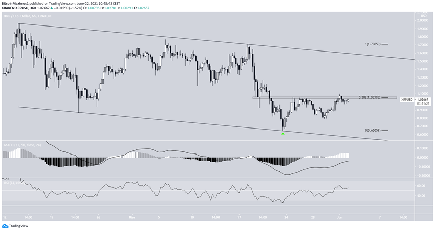 XRP đã giảm bên trong một kênh song song giảm dần kể từ ngày 14 tháng 4. Vào ngày 23 tháng 5, giá của XRP đã bật lên sau khi chạm đến đường hỗ trợ (biểu tượng màu xanh lá cây).