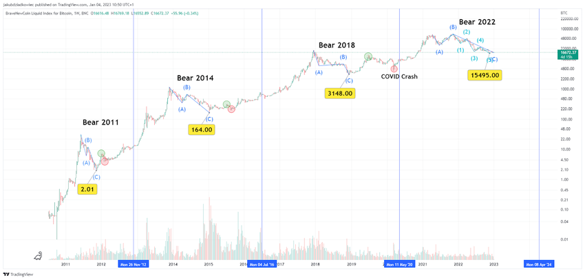 Tiếp theo, BeInCrypto lưu ý rằng sự sụt giảm trong mỗi thị trường gấu ở dạng điều chỉnh ABC theo lý thuyết Sóng Elliott. Ngay cả thị trường gấu gần đây nhất vào năm 2022 cũng có thể được dịch chuyển dưới mô hình điều chỉnh này. Tuy nhiên, có thể giả định rằng đỉnh thị trường tăng giá không đạt được vào tháng 11/2022 ở mức 69,000 USD, mà vào tháng 4/2022 ở mức 64,500 USD. Tất nhiên, giả định thứ hai dẫn đến một dạng điều chỉnh ABC khá bất thường. Mặc dù vậy, nó phù hợp với nhiều chỉ số kỹ thuật, dữ liệu trên chuỗi, hoạt động xã hội và tâm lý đầu tư trong thị trường tiền điện tử.