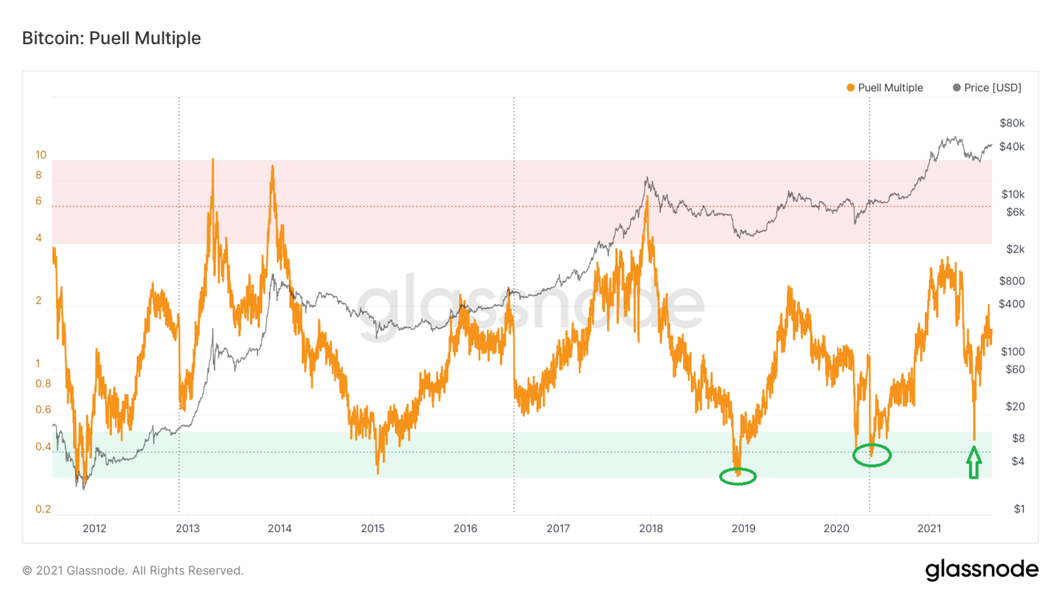 Vào ngày 27 tháng 6, chỉ báo này đạt mức thấp 0.455 và bật lên ngay lập tức (mũi tên màu xanh lá cây). Mức thấp được thực hiện bên trong vùng sinh lời thấp 0.3-0.5 (được tô màu xanh lá cây). Hai lần trước đó khu vực này đạt được là vào tháng 1 năm 2019 và tháng 7 năm 2020. Cả hai lần chỉ số nhân Puell nằm ở vùng giá trị thấp đều là khi BTC đạt mức đáy của toàn bộ chu kỳ dài hạn.