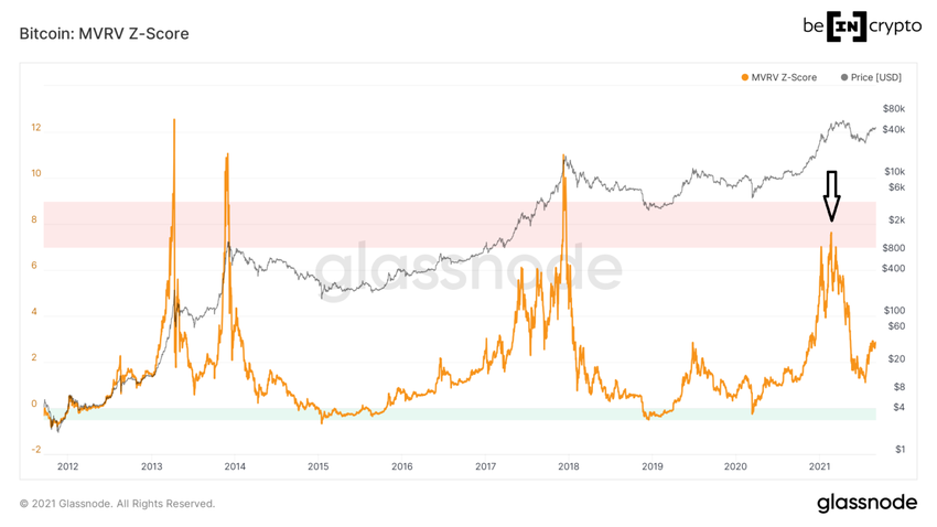 Đỉnh BTC năm 2021 nằm ở vùng có chỉ số MVRV Z-Score là 7.63 (mũi tên màu đen). Tuy nhiên, ba đỉnh lịch sử trước đó của BTC đều có chỉ số MVRV Z-Score là trên 9. Điều này có nghĩa là chúng đã vượt đáng kể so với giới hạn trên của khu vực.
