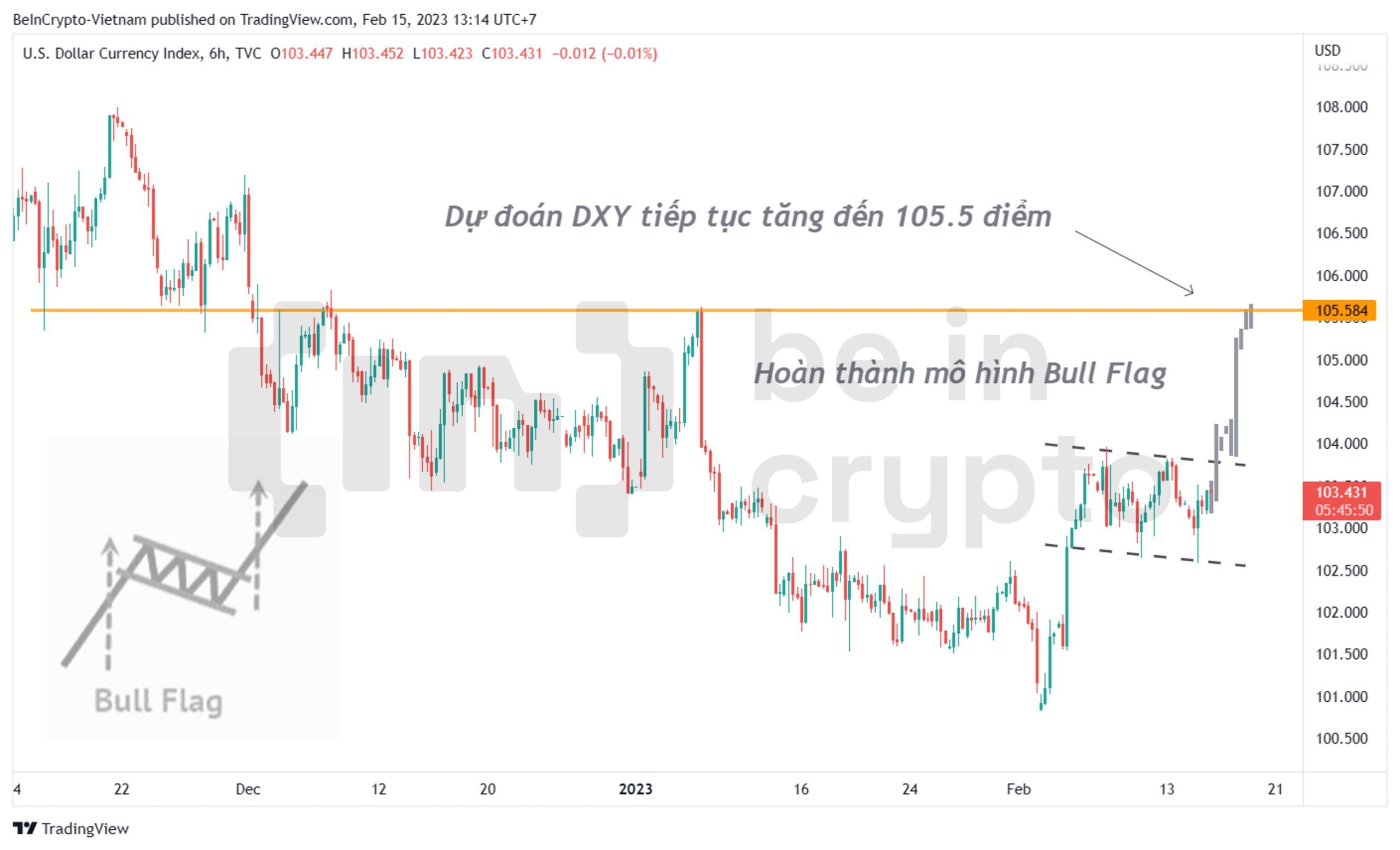 - Từ đó, chúng ta có cơ sở để dự đoán DXY sẽ hoàn thành mô hình Bull Flag (cờ tăng) với đích đến của mô hình này là 105.5 điểm. Đây cũng là mức kháng cự từ cuối năm 2022 đến nay.