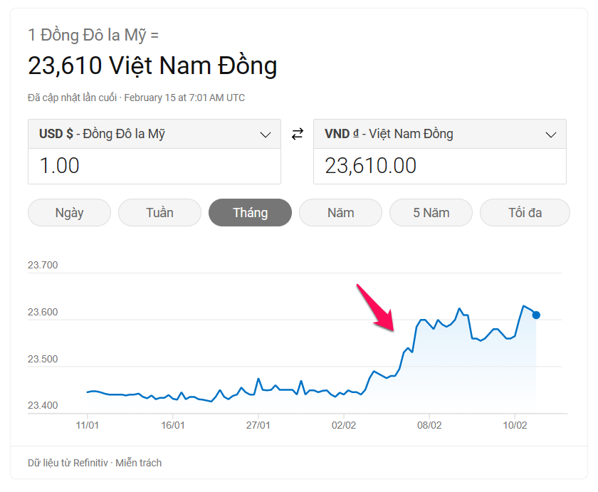 Do đó, con đường tăng lãi suất sẽ còn dài. Mức lãi suất mới cao hơn sẽ lại được công bố tháng 3 tới. DXY có nhiều lý do để tăng trở lại trong năm 2023. Tại Việt Nam, giá USD trong tháng 2 cũng bắt đầu có dấu hiệu tăng trở lại trên 23,600 VND.
