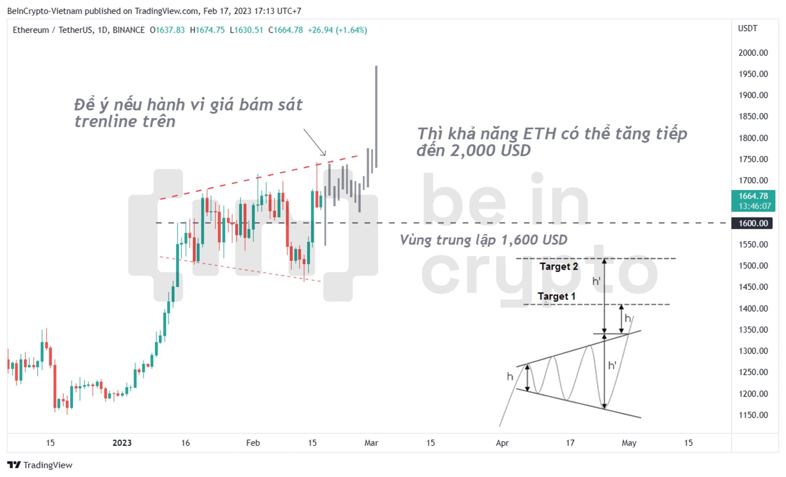 - Trong dạng biến động này, giá ETH đồng thời tạo đáy thấp hơn và tạo đỉnh cao hơn. Đây là một mô hình trung lập, kế hoạch giao dịch sẽ tùy thuộc vào tình trạng giá đang trên hay dưới mức giá trung lập của mô hình. Cụ thể ở đây là vùng 1,600 USD.