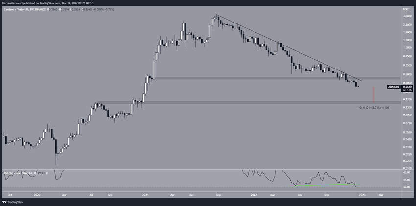 Phân tích giá ADA rất quan trọng vì vùng hỗ trợ gần nhất tiếp theo hiện là 0.150 USD. Đây là mức giảm thêm 40% so với giá hiện tại. Ngoài ra, việc phá vỡ hỗ trợ cũng đồng thời làm phá vỡ đường phân kỳ tăng tiềm năng trong chỉ số RSI hàng tuần (đường màu xanh lá cây). Vì hành động giá là giảm nên đây là dấu hiệu tăng giá duy nhất còn lại có thể bắt đầu đảo chiều.