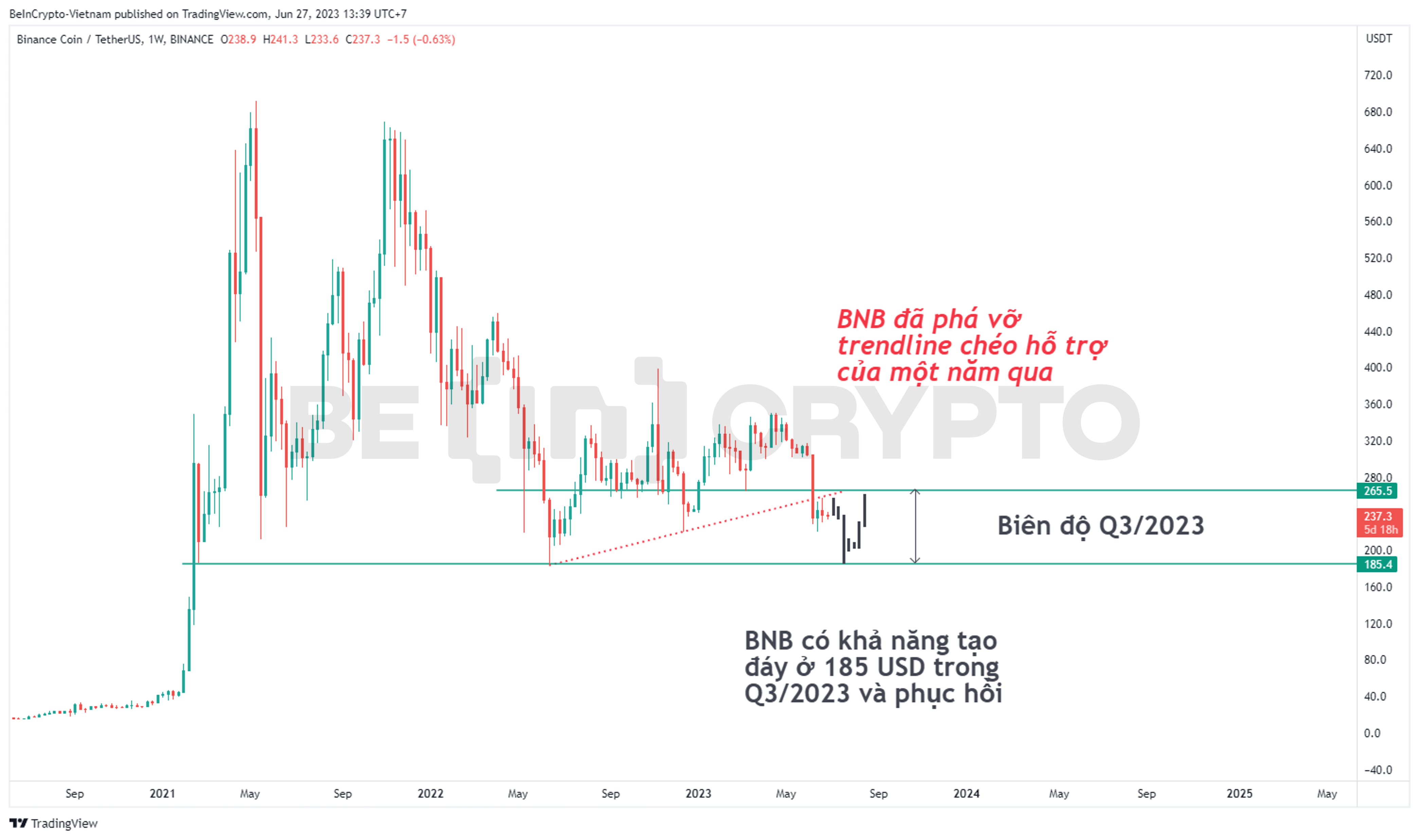 Đà giảm tháng 6 của BNB đã khiến giá phá vỡ đường trendline chéo vốn đóng vai trò hỗ trợ trong suốt một năm qua. Từ đây, giá có một vài tuần re-test trendline này như một hành vi giá thường thấy. Hỗ trợ tiếp theo là vùng 185 USD, tương đương với đáy của năm 2022. Tại đây, BNB kỳ vọng sẽ được mua lại mạnh mẽ.