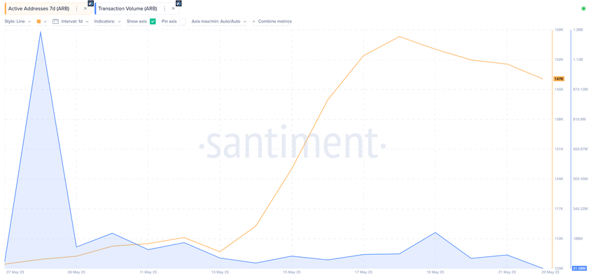 Trong khi Arbitrum đã trở thành tiêu đề cho việc áp dụng ngày càng tăng và hoạt động on chain tăng lên. Mặc dù số lượng địa chỉ trên chuỗi tăng, nhưng khối lượng giao dịch ARB vẫn tiếp tục giảm.