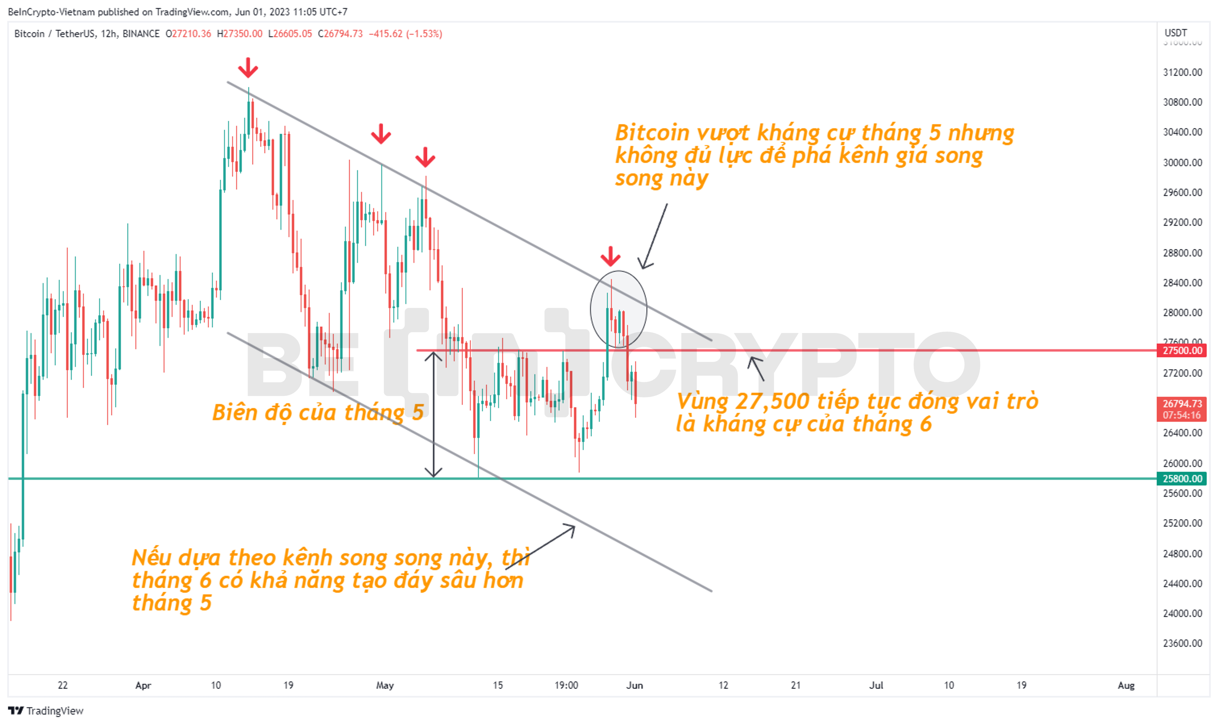 - BTC dù vượt kháng cự 27,500 USD nhưng lại không thể đủ lực để chiến thắng kênh giá song song của hai tháng qua. Kênh giá này có thể sẽ tiếp tục chi phối đường giá BTC trong tháng 6. Nghĩa là BTC vẫn có khả năng tạo đáy sâu hơn tháng 5.