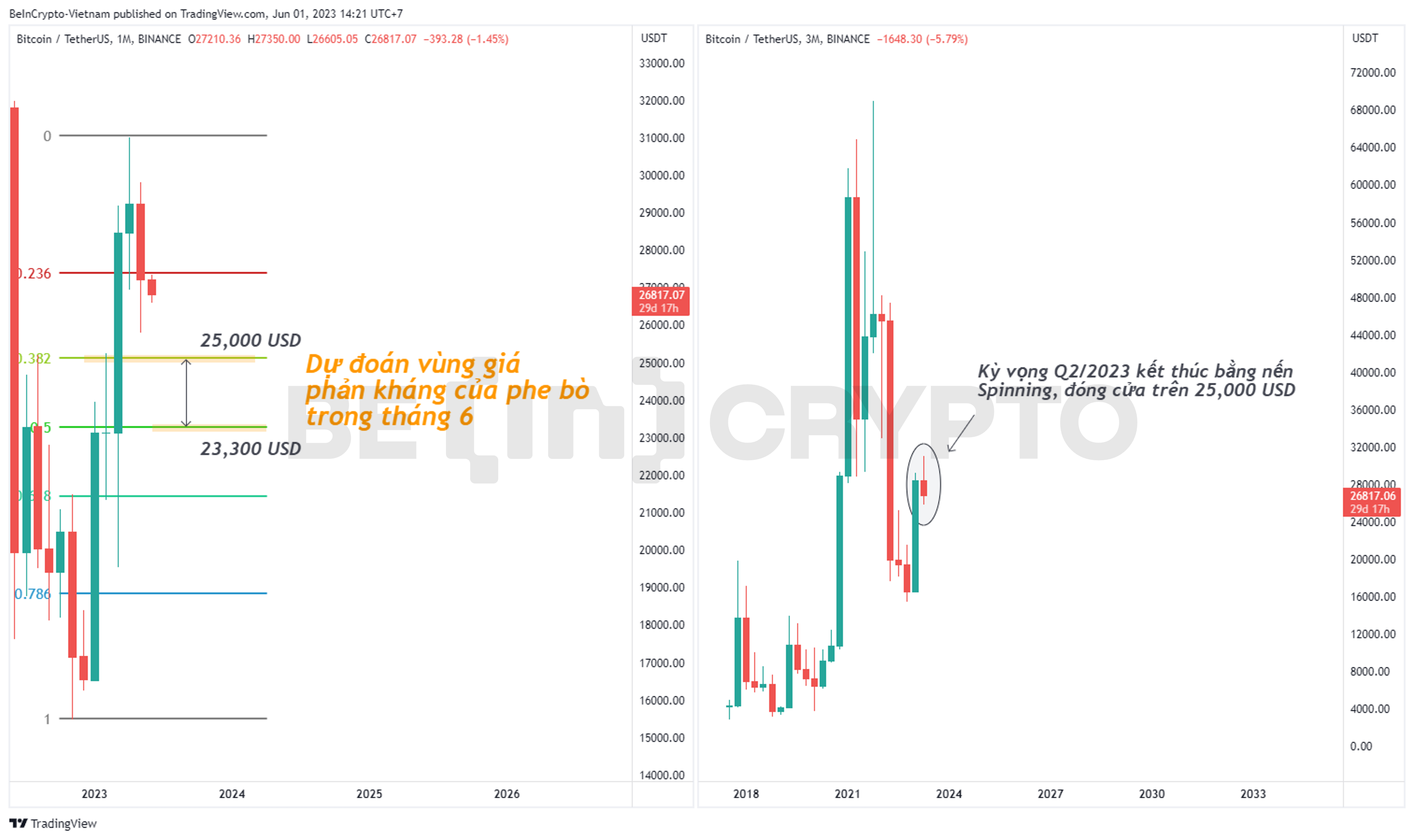 - Nhìn qua biểu đồ nến quý. Q1/2023 thể hiện lực mua mạnh mẽ làm tiền đề cho cả năm 2023. Q2/2023 dự đoán chỉ là một sự chững lại tạm thời thể hiện bằng một nến Spinning đóng cửa trên 25,000 USD. Nếu dự đoán này thành công, thì tầm nhìn cho cả năm 2023 vẫn rất sáng sủa với Bitcoin.