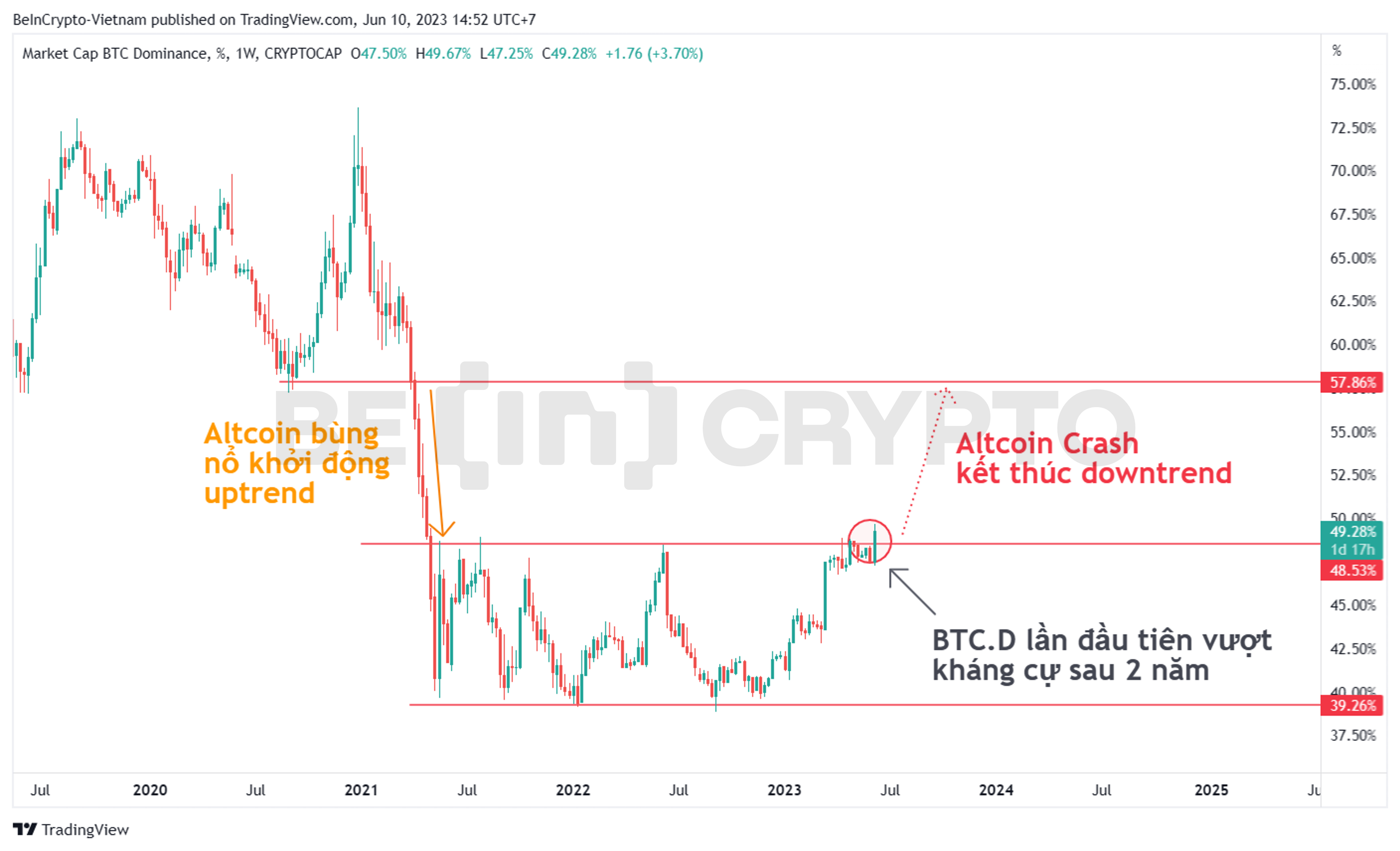 - Vùng biên độ BTC.D giữa 57% và 49% là một vùng biên độ đặc biệt. Trong năm 2021, khi uptrend mới khởi động, BTC.D đã giảm mạnh từ 57% về dưới 49% một cách nhanh chóng. Nay BTC.D vừa phá kháng cự 49% và đang có tín hiệu trở lại vùng biên độ này.