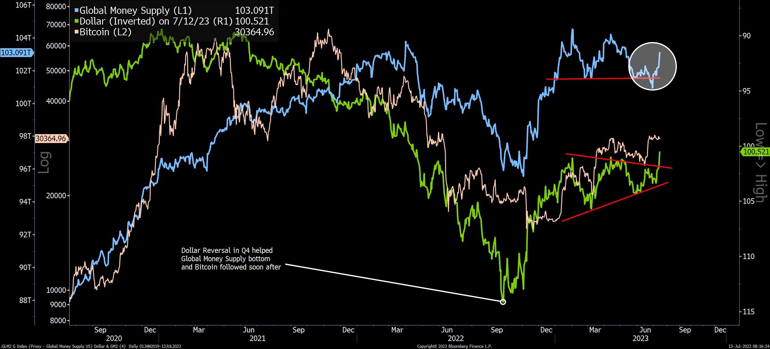 Để lập luận dựa trên mối tương quan này thêm phần thuyết phục, phân tích trên bổ sung thêm biến động nguồn cung M2 toàn cầu (màu xanh dương) trong sự so sánh.