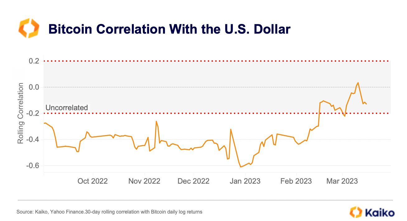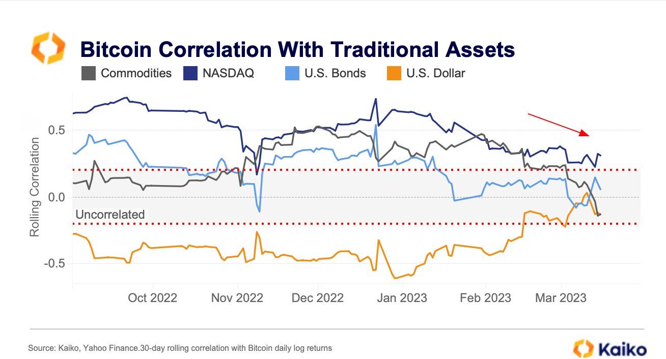 Mối tương quan nghịch giữa BTC và USD đã gần như biến mất trong tháng 3. Bitcoin đang có động lực tăng của riêng mình, điều này càng thể hiện rõ hơn qua biểu đồ sau.