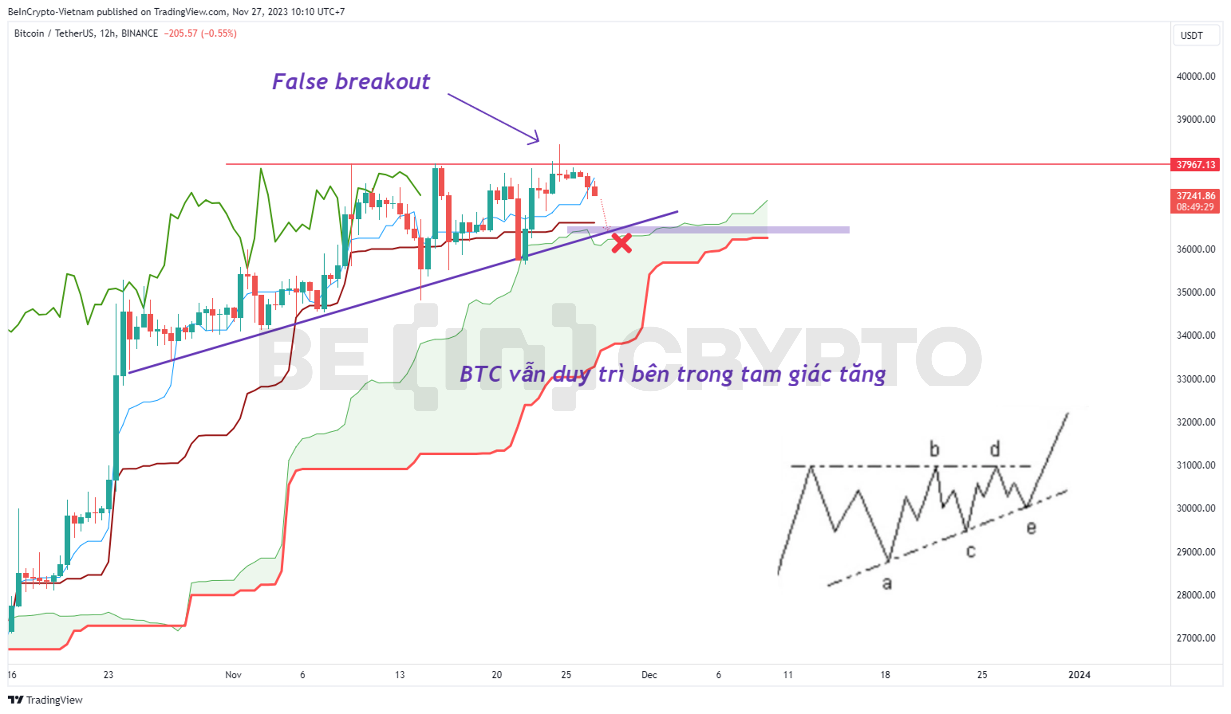 Phân tích trên được thực hiện trong khung 12h và điều kiện cần của kịch bản là BTC phải giữ được trên 36,500 USD để tam giác tăng không bị phá vỡ.