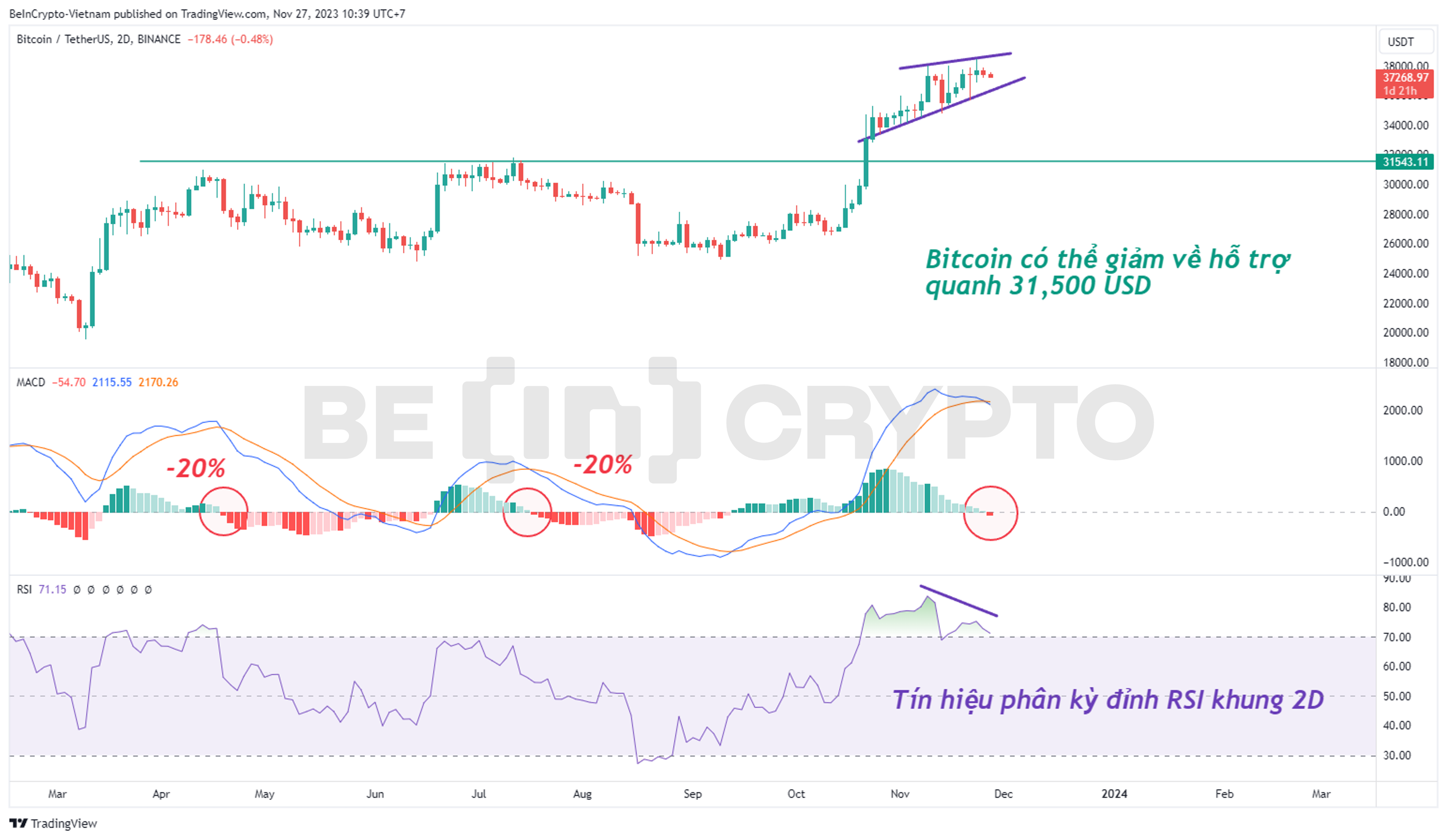 - Đầu tiên, chỉ báo RSI khung 2 ngày (2D) đã hình thành tín hiệu phân kỳ đỉnh dự báo khả năng giá BTC có thể giảm trong tháng cuối năm. Với tín hiệu này, những dự đoán BTC tăng đến 40,000 USD trong tháng 12 là không khả thi.