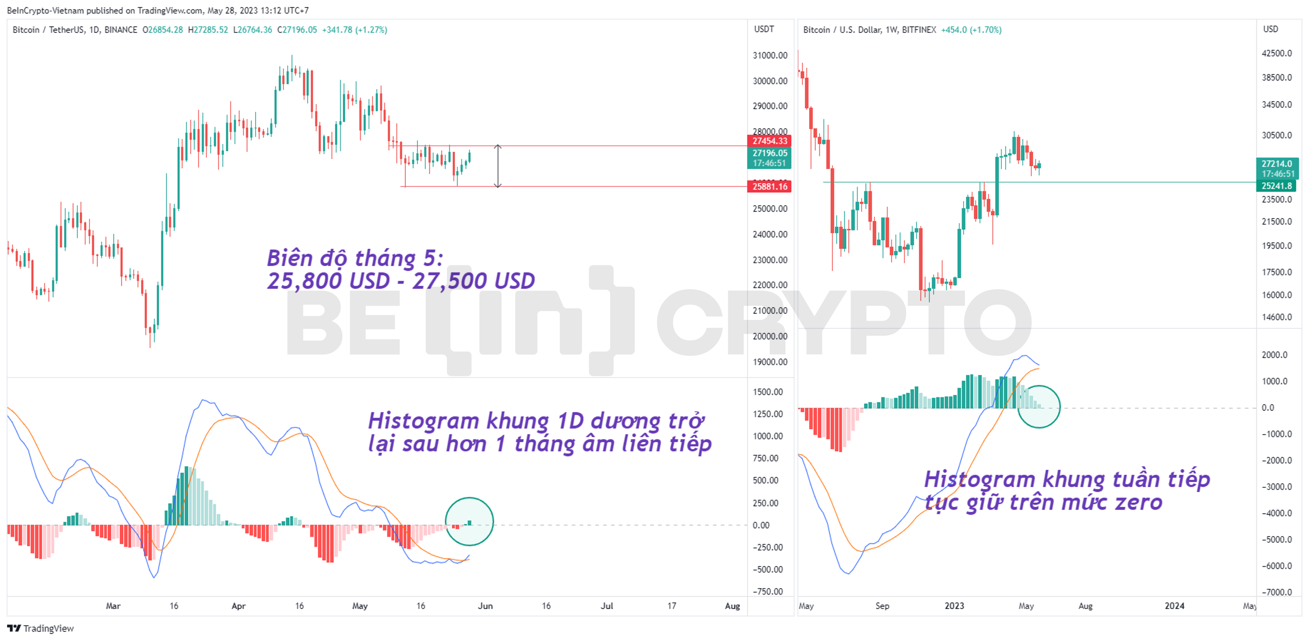 - Đầu tiên là biên độ của tháng 5 đã được xác định rõ ràng. Đó là giữa 25,800 USD – 27,500 USD. Giá Bitcoin chỉ cần đóng cửa nến ngày bên ngoài biên độ trên là có thể xác định xu hướng trong ngắn hạn. Thêm vào đó, histogram của chỉ báo MACD-H đã lần đầu tiên dương trở lại sau hơn một tháng âm liên tiếp.