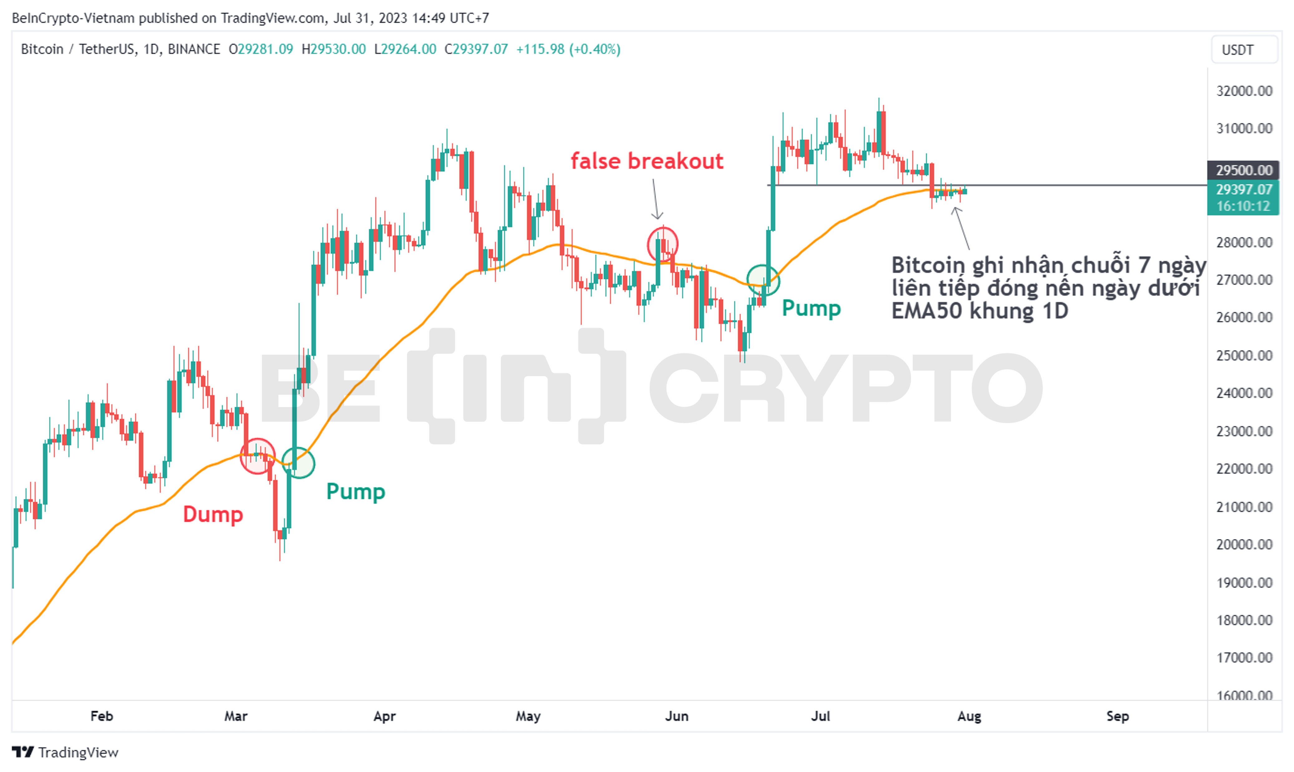 Phương pháp quan sát kỹ thuật sau sử dụng EMA50 khung ngày để đo lường sức mạnh và thói quen đường giá BTC.