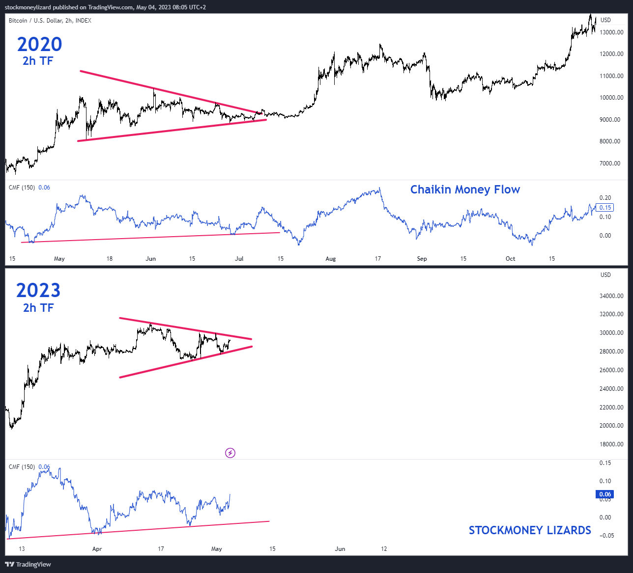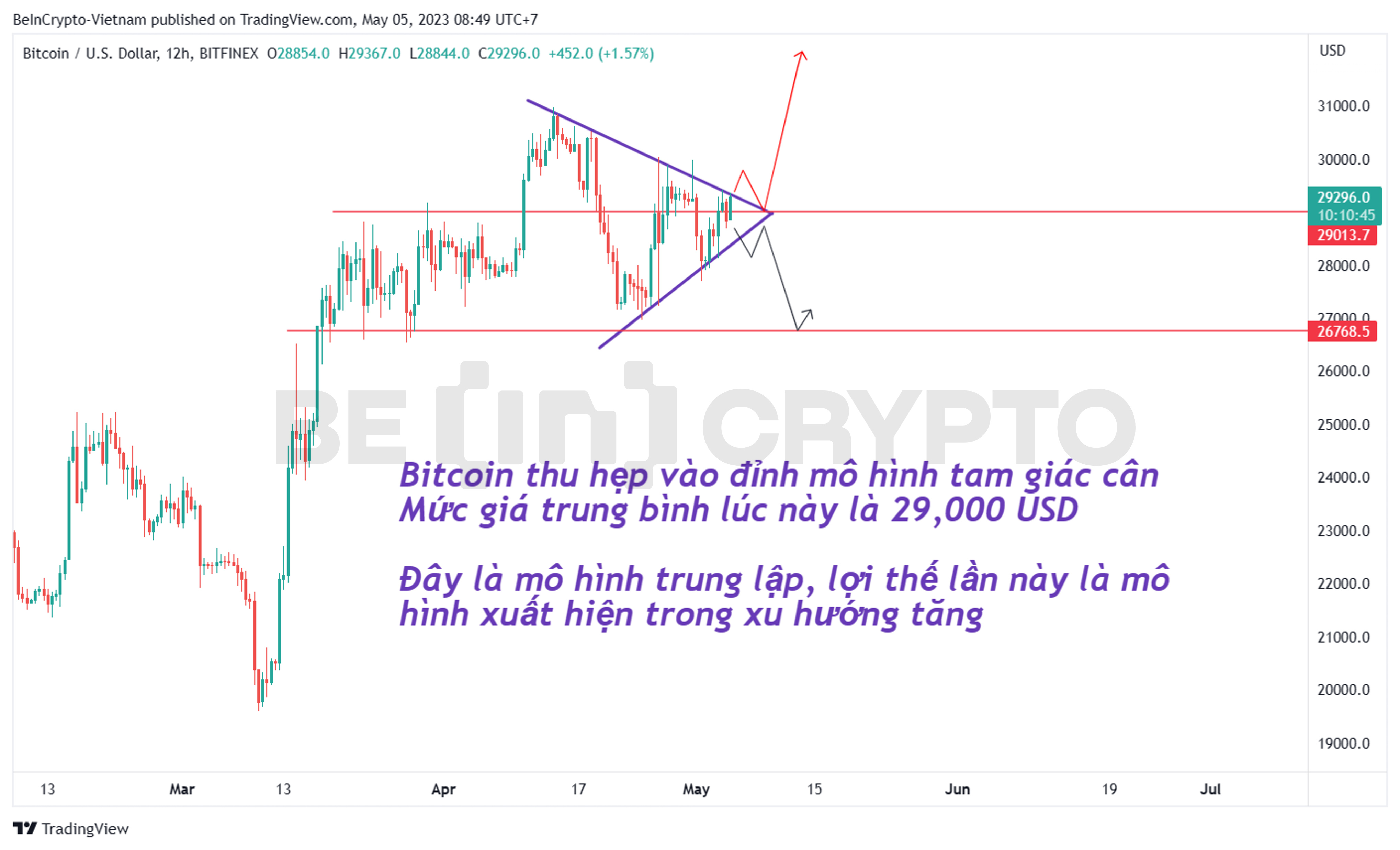 - Dù rằng mô hình tam giác cân theo lý thuyết là một mô hình giá trung lập. Nhưng bối cảnh xuất hiện của nó sẽ ảnh hưởng đến dự đoán sau đó. Lợi thế lần này của mô hình là nó xuất hiện trong xu hướng Bitcoin đang tăng từ đầu năm đến nay.