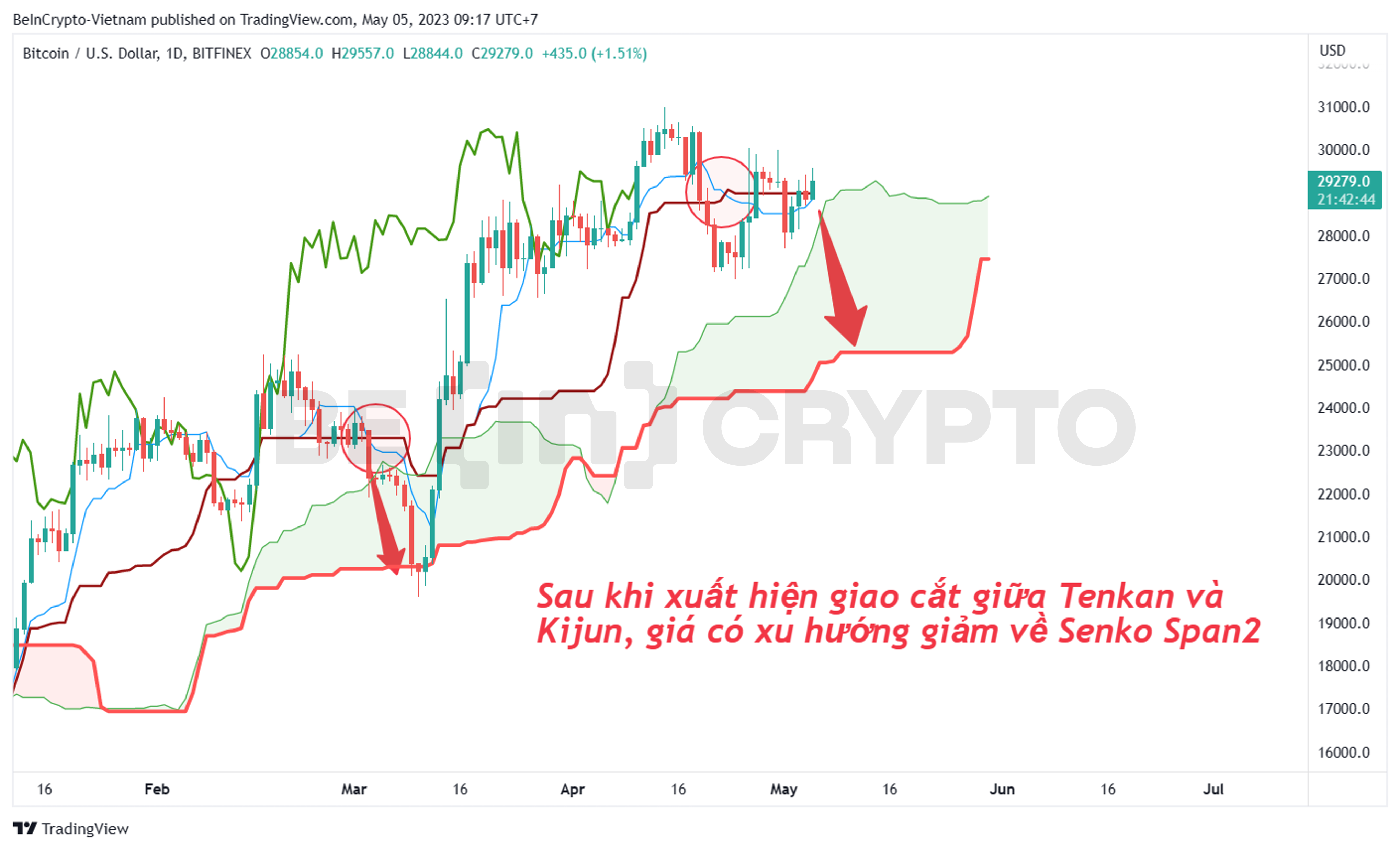 Cụ thể, tín hiệu đó là đường Tenkan Sen cắt xuống Kijun Sen. Tín hiệu này trong quá khứ đã khởi động cho đà giảm về đường hỗ trợ Senko Span2. Do đó, lần này khi tín hiệu một lần nữa xuất hiện cũng cần dè chừng cho kịch bản giá có thể giảm về vùng 25,000 USD.