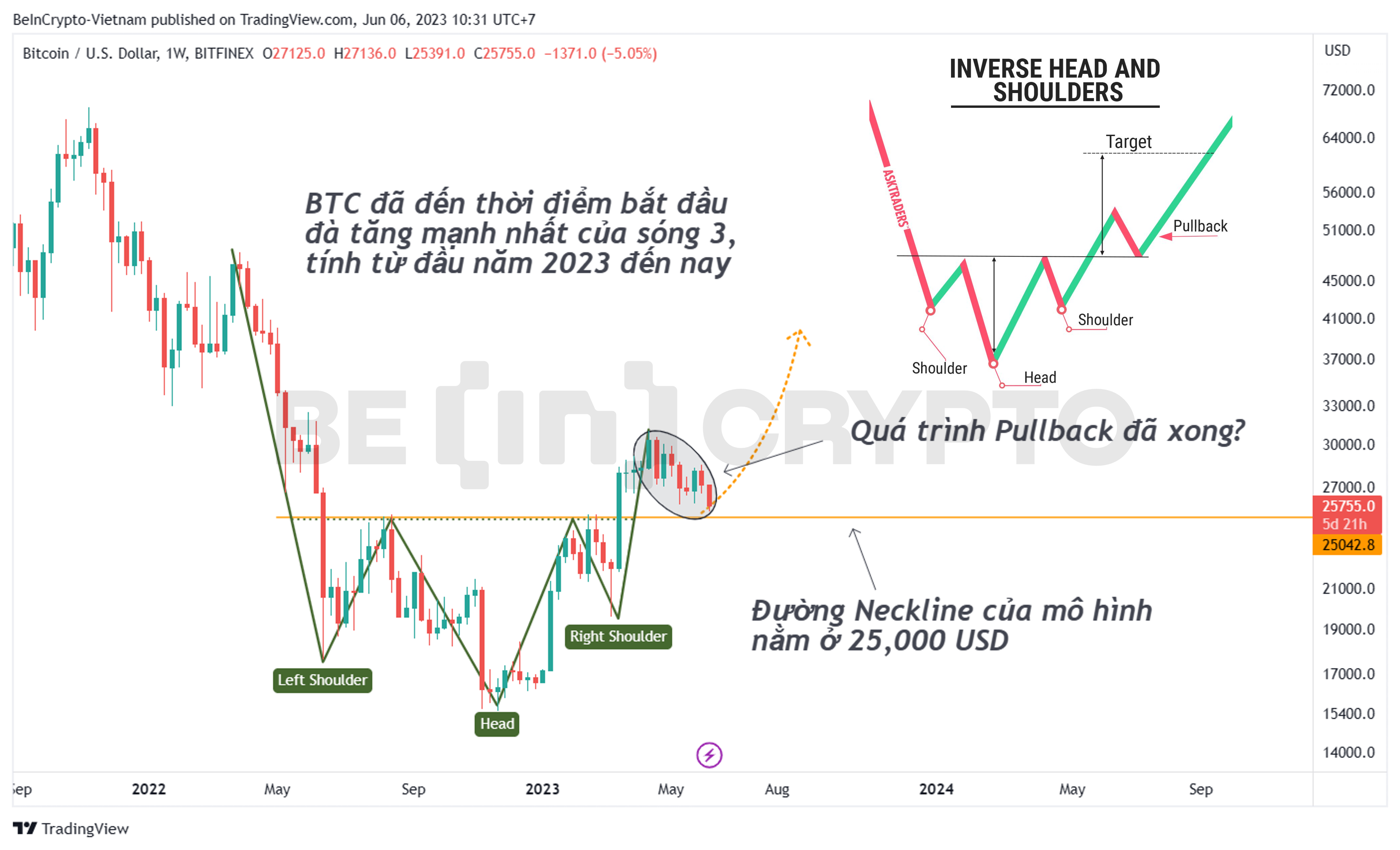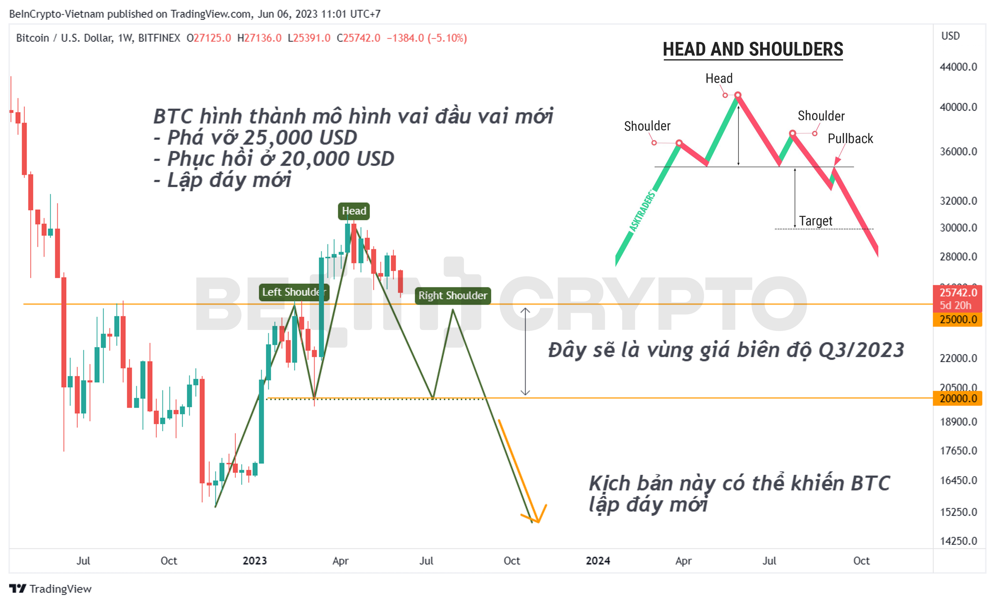 - Khi đó, sự sợ hãi sẽ trở lại như giai đoạn cuối năm 2022, và biên độ của Q3/2023 sẽ tiêu cực hơn khi nằm giữa 20,000 USD và 25,000 USD. Lúc bấy giờ, người ta sẽ nhớ đến mô hình vai đầu vai như trên.