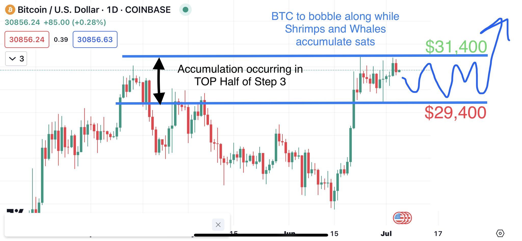 - Kịch bản này cho rằng, để đà tăng được tiếp tục, BTC chỉ nên điều về tối đa 29,400 USD. Và có thể duy trì sideway biên độ hẹp trong vài tuần giữa 29,400 USD – 31,000 USD trước khi bức phá. Biến động sideway này sẽ là bằng chứng cho thấy kỳ vọng tăng giá vẫn còn, người bán vẫn nhiều hy vọng hơn sợ hãi.