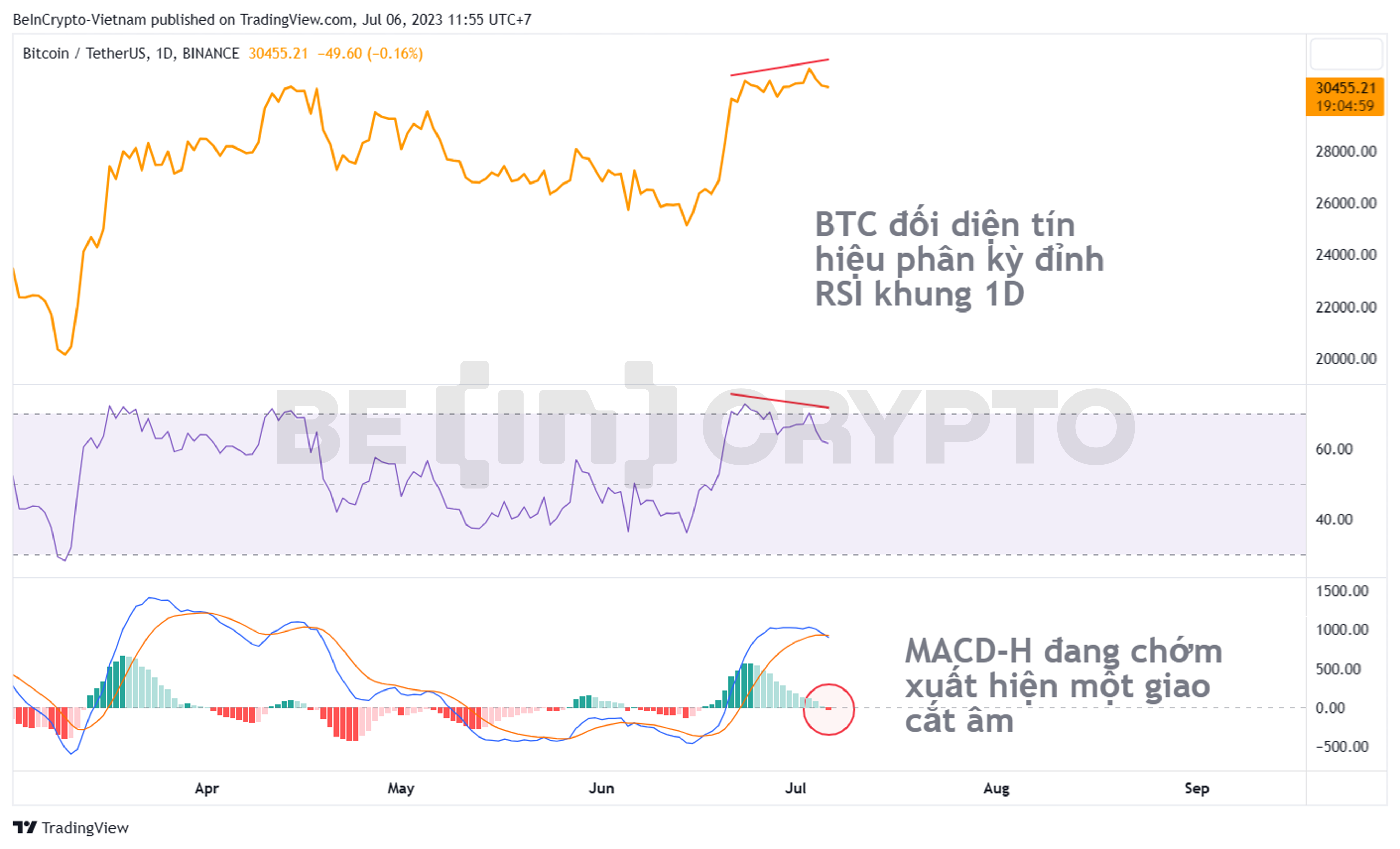 - Đầu tiên đó là tín hiệu phân kỳ đỉnh RSI. Tín hiệu này hiệu nghiệm với giá đóng cửa của Bitcoin trong khung ngày. Những ngày đầu tháng 7 giá BTC đóng cửa ở mức giá cao hơn, nhưng chỉ báo RSI tạo mức thấp hơn. Như vậy, RSI với ý nghĩa “chỉ số sức mạnh tương đối” đang muốn nói rằng sức mạnh phe bò đã suy yếu.