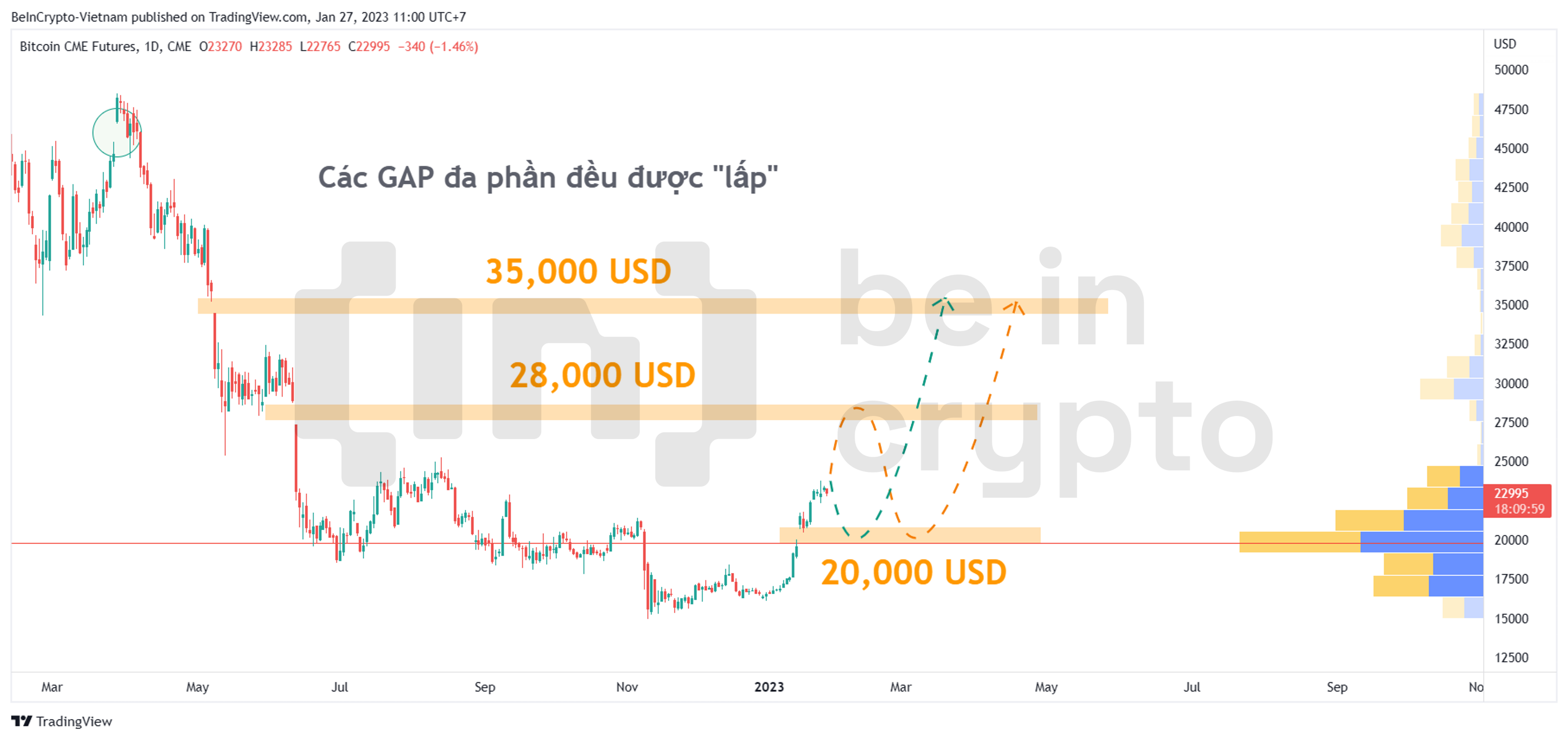 - Đó là vùng 35,000 USD, 28,000 USD và vùng 20,000 USD mới được hình thành trong ngày cuối tuần trước khi BTC tiếp tục tăng đến gần 24,000 USD. Những GAP này được tạo nên do giá BTC vẫn tiếp tục biến động trong ngày cuối tuần, trong khi biểu đồ CME dừng lại và tiếp tục cập nhật vào ngày thứ hai tuần kế tiếp.