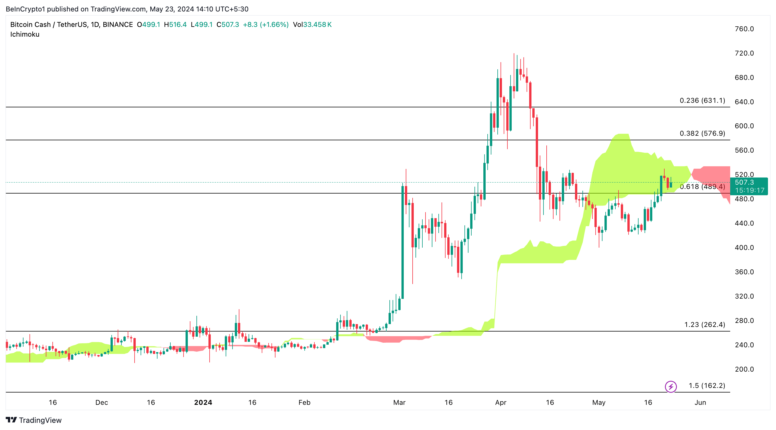 Bitcoin Cash (BCH) hiện đang cưỡi sóng tăng, nhưng việc giảm xuống dưới mô hình Ichimoku Cloud hàng ngày có thể báo hiệu sự chuyển sang xu hướng giảm.