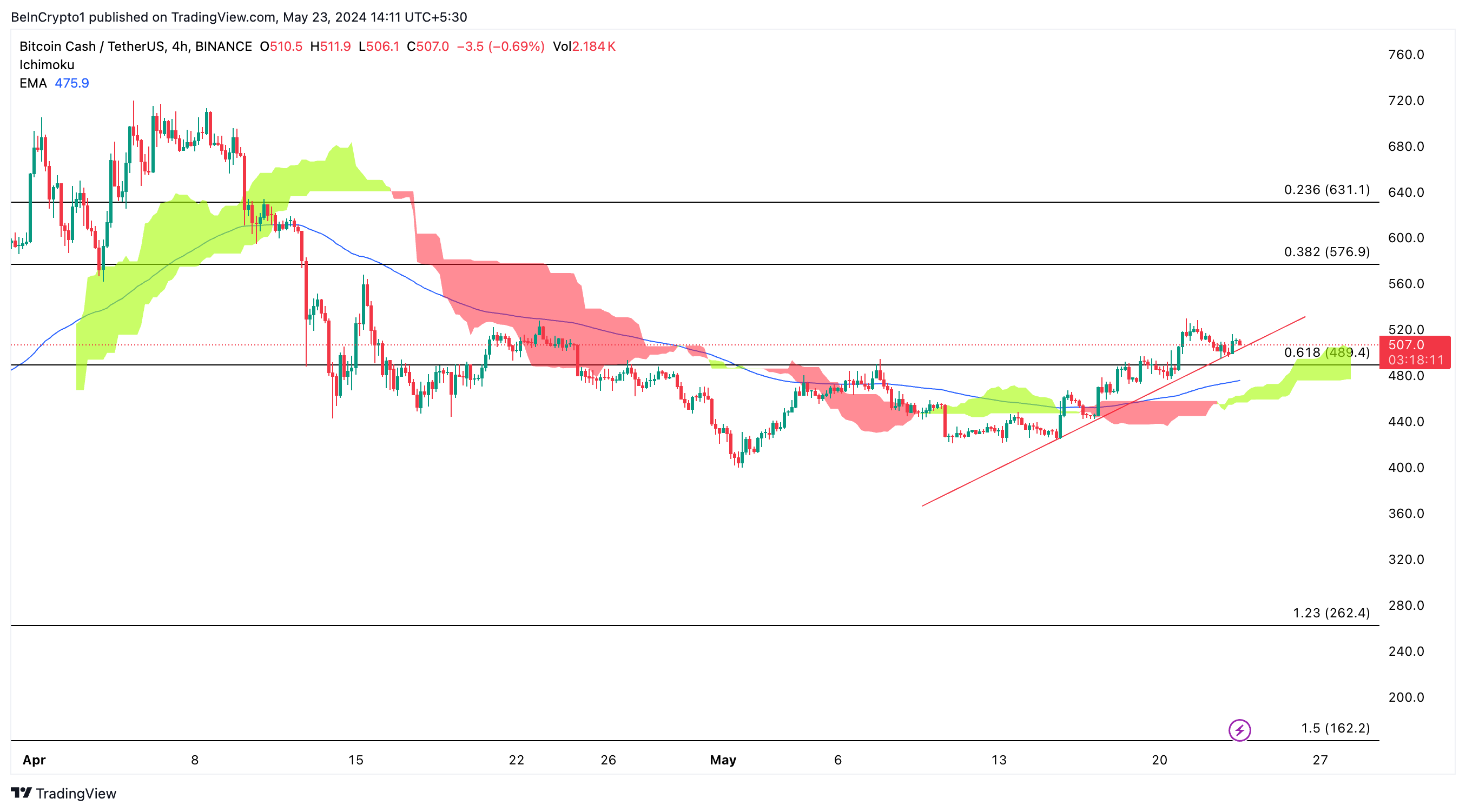 Một sự phá vỡ thành công trên nó có thể báo hiệu động lực tăng giá hơn nữa. Các mức kháng cự Fibonacci chính cần theo dõi bao gồm mức 0.382 ở mức 576.9 USD; mức 0.236 ở mức 631.1 USD và mức 0.618 ở mức 489.4 USD, đóng vai trò là hỗ trợ quan trọng. Trên khung thời gian 4 giờ, BCH đang giao dịch trên khu vực đám mây Ichimoku, cho thấy xu hướng tăng ngắn hạn.
