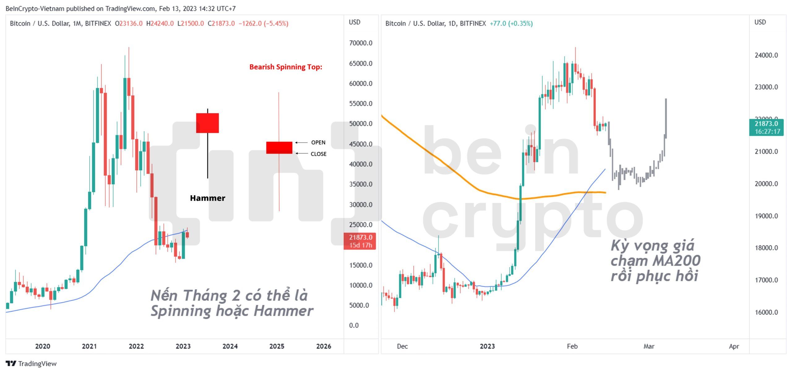 - Theo đó, nến BTC trong khung tháng sẽ tạo thành một nến spinning hoặc hammer trong tháng 2. Điều này cũng tương ứng với hành vi giá re-test MA50 khung tháng. Một mô hình nến trung lập như vậy là phù hợp với tâm lý vừa lo ngại vừa kỳ vọng của cộng đồng đầu tư Crypto hiện tại.