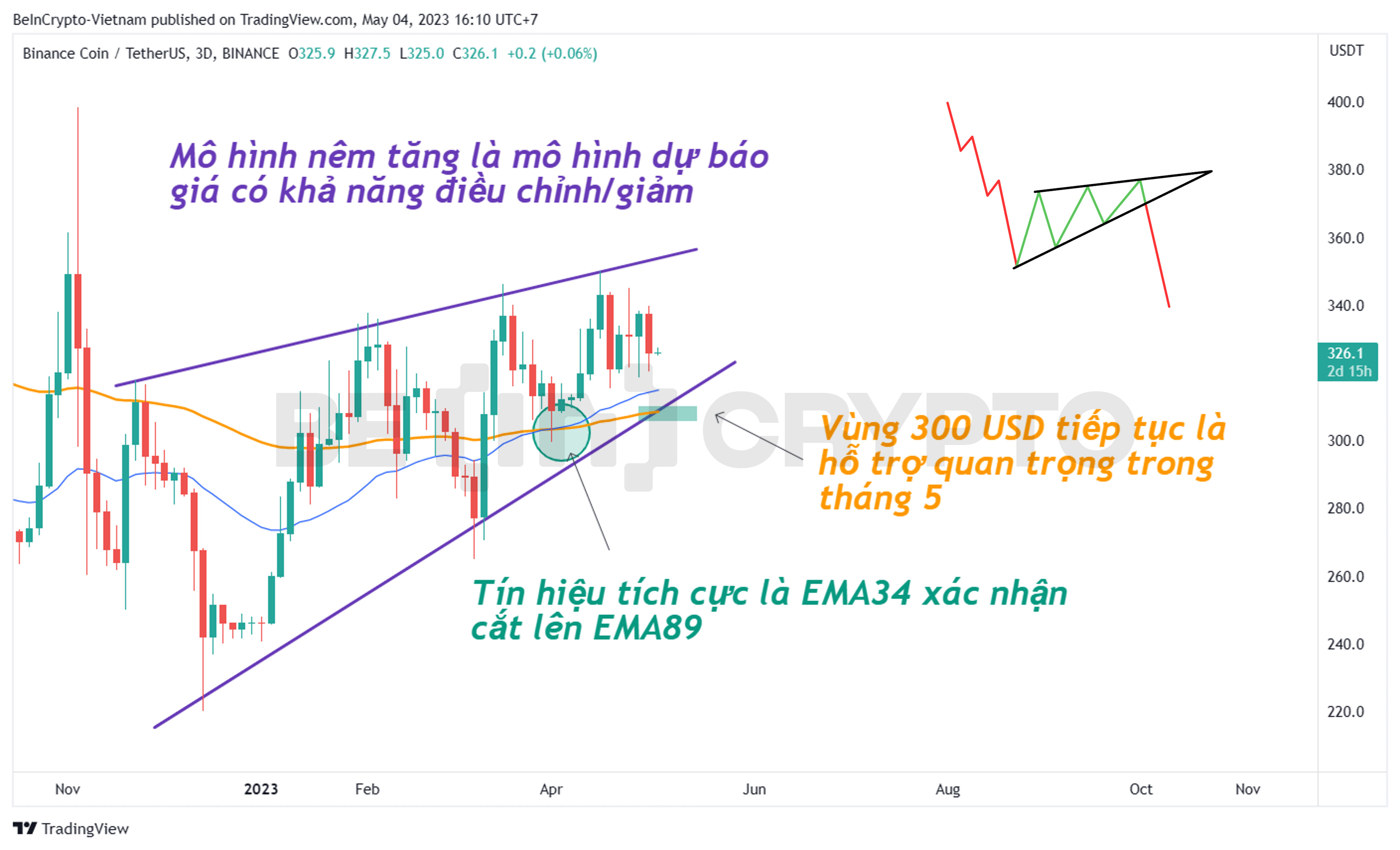 Như vậy, vùng 300 USD tiếp tục là hỗ trợ tốt nhất cua BNB trong tháng 5 này. Nếu xuất hiện nến 3D đóng cửa dưới đây thì khả năng mô hình nêm tăng sẽ hoàn tất vai trò dự báo của nó.