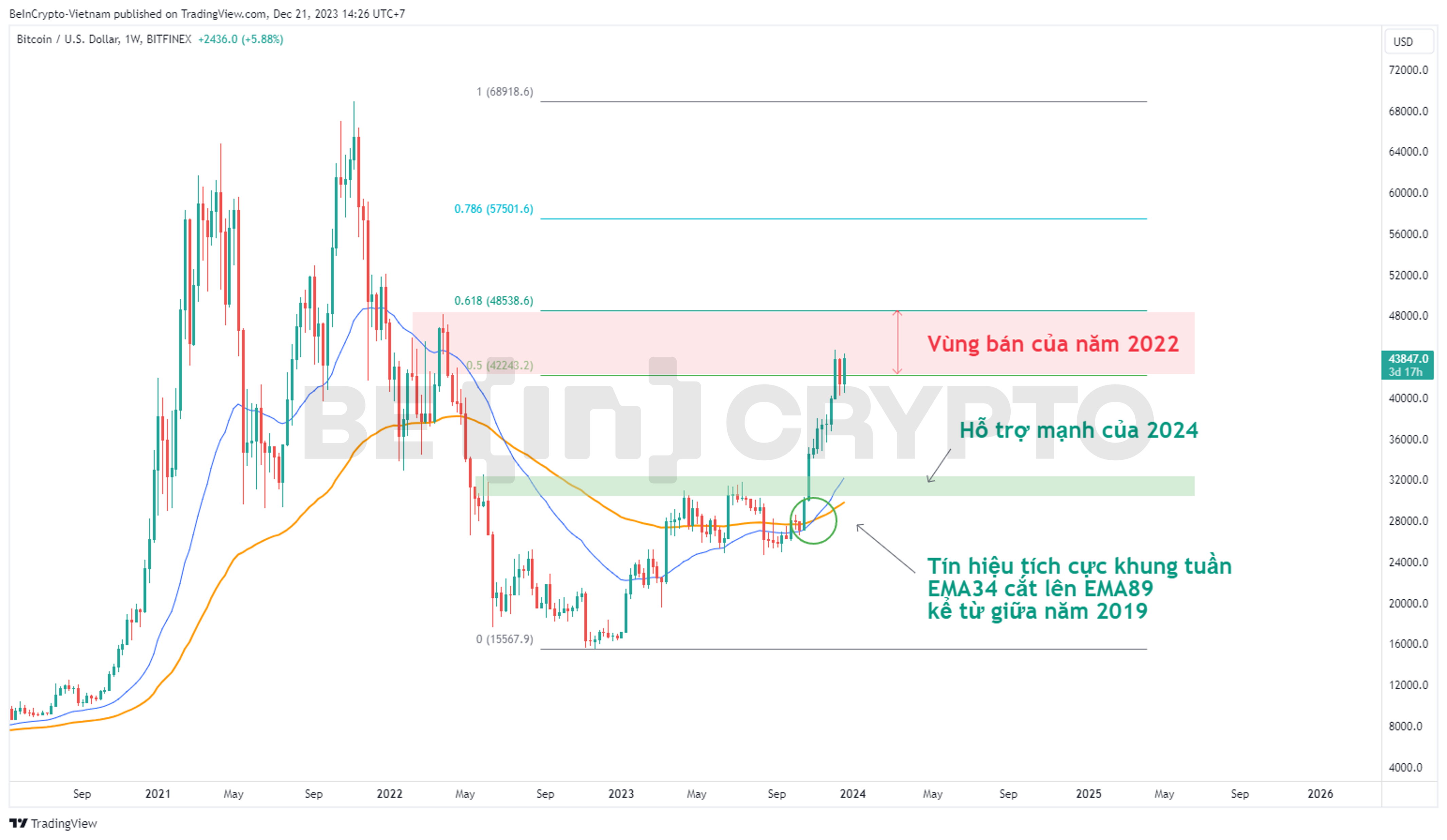 - Dù vậy, nếu sử dụng thước đo giá Fibonacci cho toàn bộ tiến trình từ ATH đến đáy, thì vùng giá giữa fibo 0.5 và fibo tỷ lệ vàng 0.618 là kháng cự mạnh, cũng là vùng bán của năm 2022. Vùng này tương đương với biên độ 42,000 USD – 48,500 USD. Một lần nữa, vùng 48,500 USD được xác nhận.