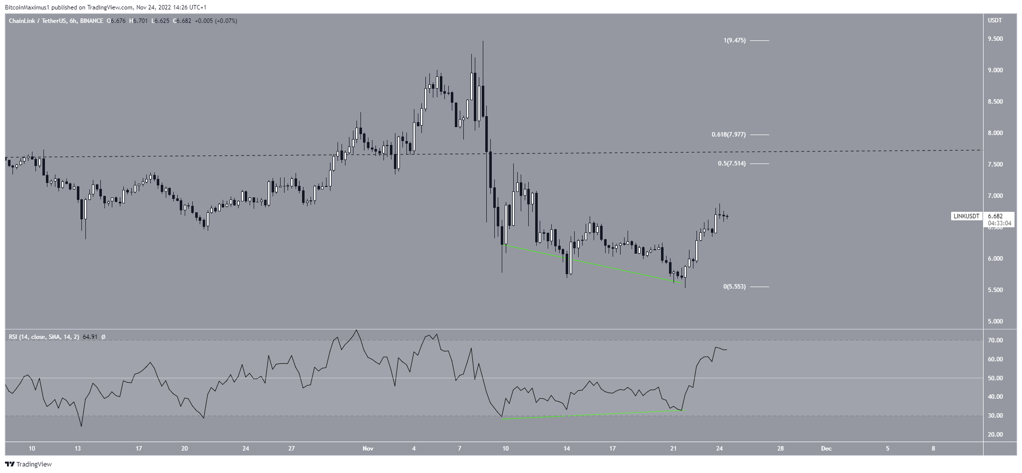 Biểu đồ 6 giờ (H6) cho thấy sự phân kỳ tăng đang phát triển kể từ ngày 19/11 (màu xanh lục). Hơn nữa, giá LINK đã phá vỡ đường kháng cự giảm dần trong khung thời gian ngắn hạn. Do đó, dự kiến sẽ có một chuyển động đi lên về phía giữa kênh. Đường giữa của kênh cũng trùng với vùng kháng cự thoái lui Fib 0.5 – 0.618 ở mức 7.51 USD- 8 USD.
