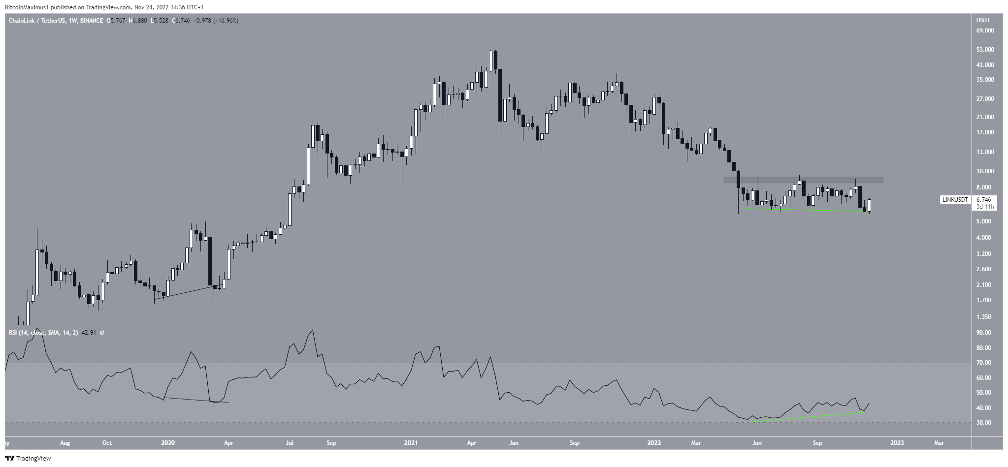 Giá Chainlink đã giảm kể từ khi đạt mức ATH là 53 USD vào tháng 5/2021. Xu hướng giảm dẫn đến mức thấp nhất là 5.30 USD vào tháng 6/2022.