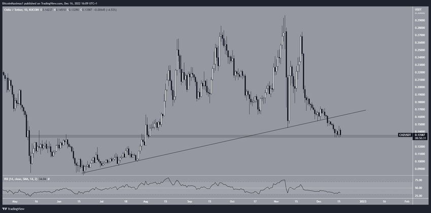 Giá CHZ đã giảm kể từ ngày 07/11. Nó tạo ra mức đỉnh thấp hơn vào ngày 19/11 trước khi giảm mạnh. Vào ngày 07/12, nó đã phá vỡ đường hỗ trợ tăng dần được tạo kể từ tháng 6. Đây là một dấu hiệu cho thấy chuyển động đi lên đã kết thúc.