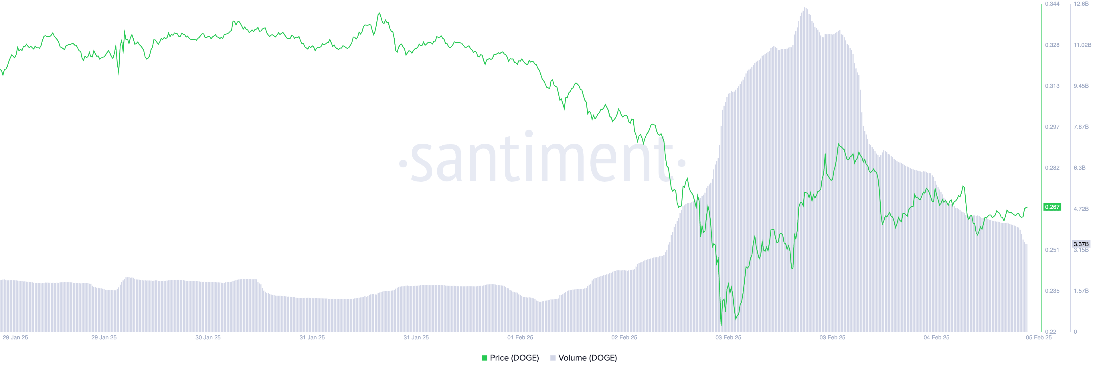 Tuy nhiên, thông báo này không tạo ra động lực đáng kể trên thị trường. DOGE đang giao dịch ở mức 0.26 USD tại thời điểm viết bài, ghi nhận mức tăng nhẹ 1% trong 24 giờ qua. Trong cùng khoảng thời gian, khối lượng giao dịch vẫn thấp, cho thấy đợt tăng giá này được thúc đẩy bởi các giao dịch đầu cơ ngắn hạn hơn là áp lực mua mạnh. Khối lượng giao dịch của DOGE đã đạt tổng cộng 3.37 tỷ USD trong 24 giờ qua, giảm 50% trong khoảng thời gian đó.