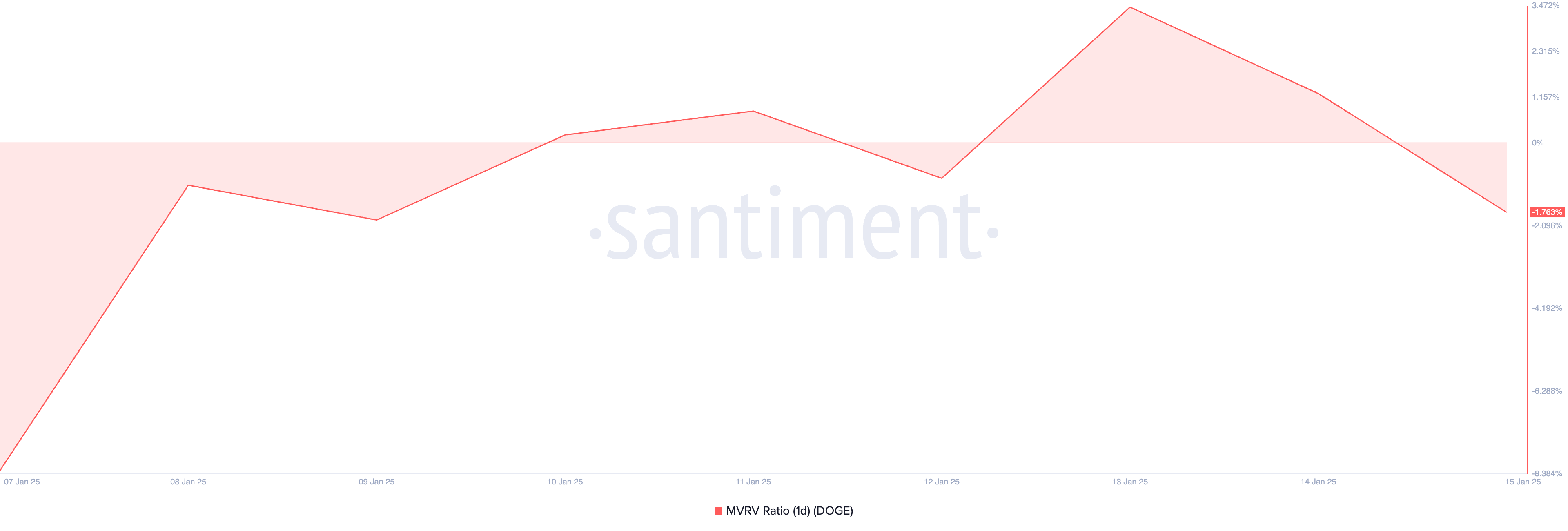 Lý do đằng sau sự gia tăng tích lũy cá voi DOGE gần đây là rõ ràng. Các chỉ số từ tỷ lệ giá trị thị trường so với giá trị thực (MVRV) âm cho thấy đồng meme hiện đang bị định giá thấp, tạo cơ hội mua lý tưởng cho những ai muốn tận dụng xu hướng thị trường. Tại thời điểm BeInCrypto viết bài, tỷ lệ MVRV trong một ngày của token là -1.76. Chỉ số này đo lường liệu một tài sản có bị định giá thấp hay cao.