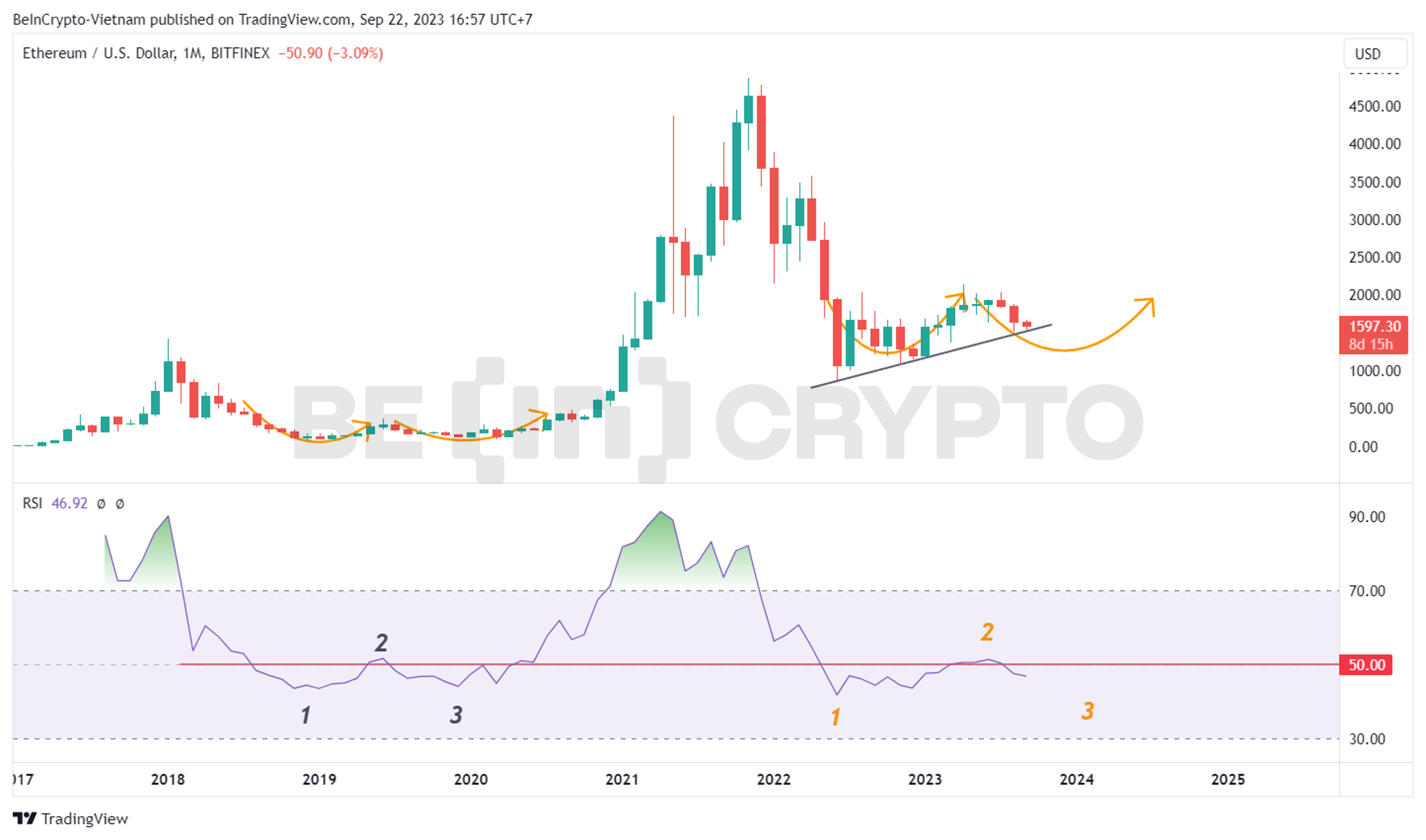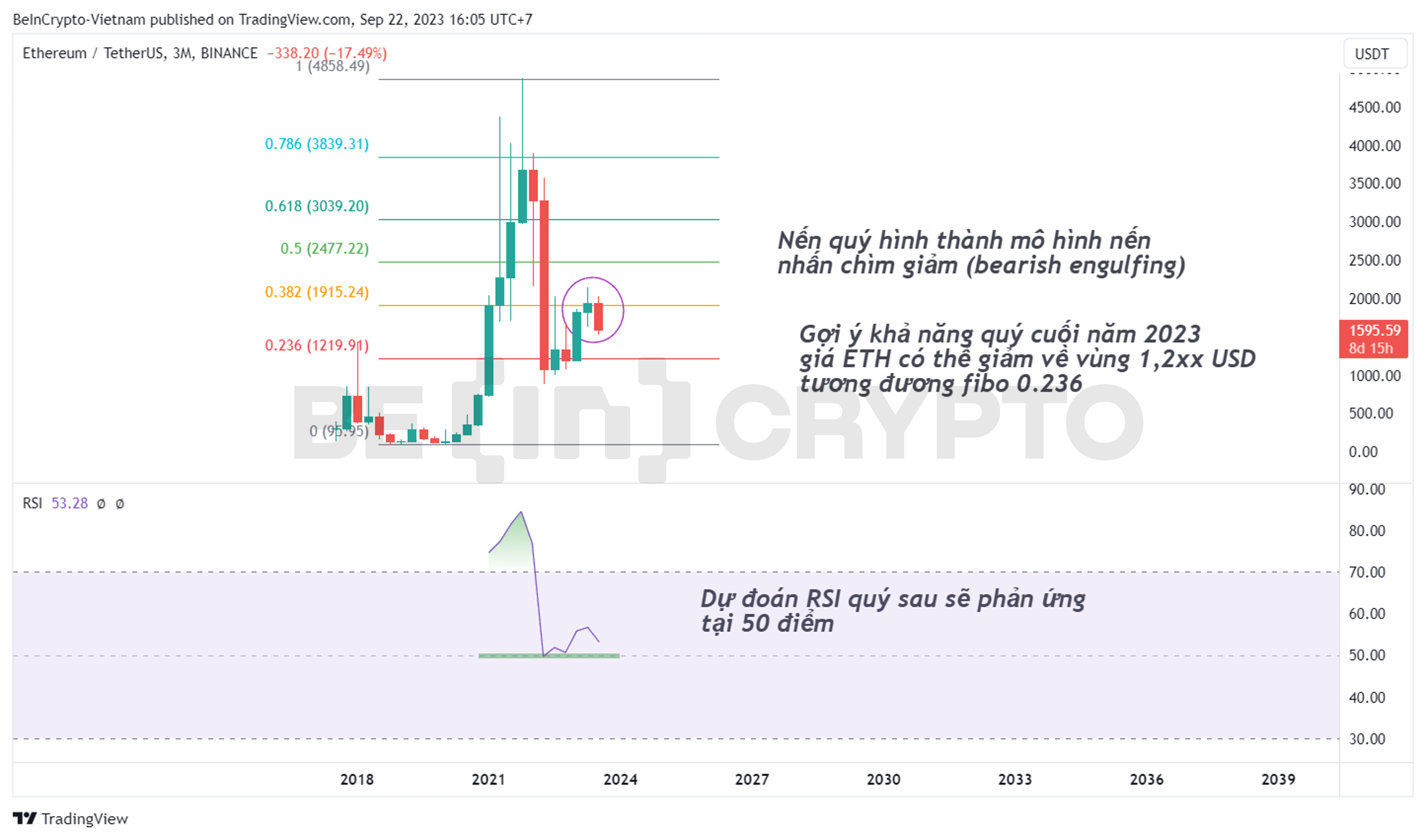 Nến quý (tức 3 tháng) cho cái nhìn xa hơn về giá ETH cho đến cuối năm. Bằng cách kết hợp với chỉ báo RSI và thước đo giá Fibonacci, có thể thấy vài đặc điểm đáng lưu ý như sau: