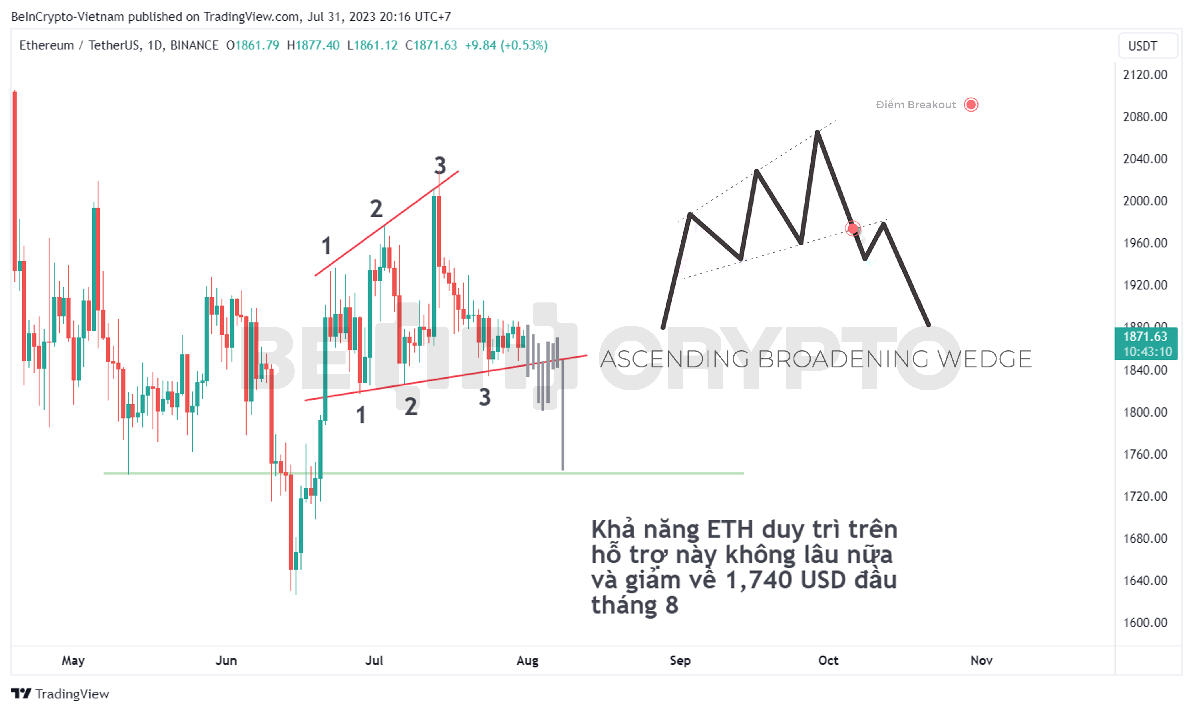 - Ngược lại, nếu phe gấu vẫn chiếm ưu thế trong những ngày đầu tháng 8. Giá ETH có thể chững lại tại trendline của mô hình nêm tăng mở rộng một thời gian ngắn, giá sẽ breakout và giảm về vùng 1,730 USD như nói trên.