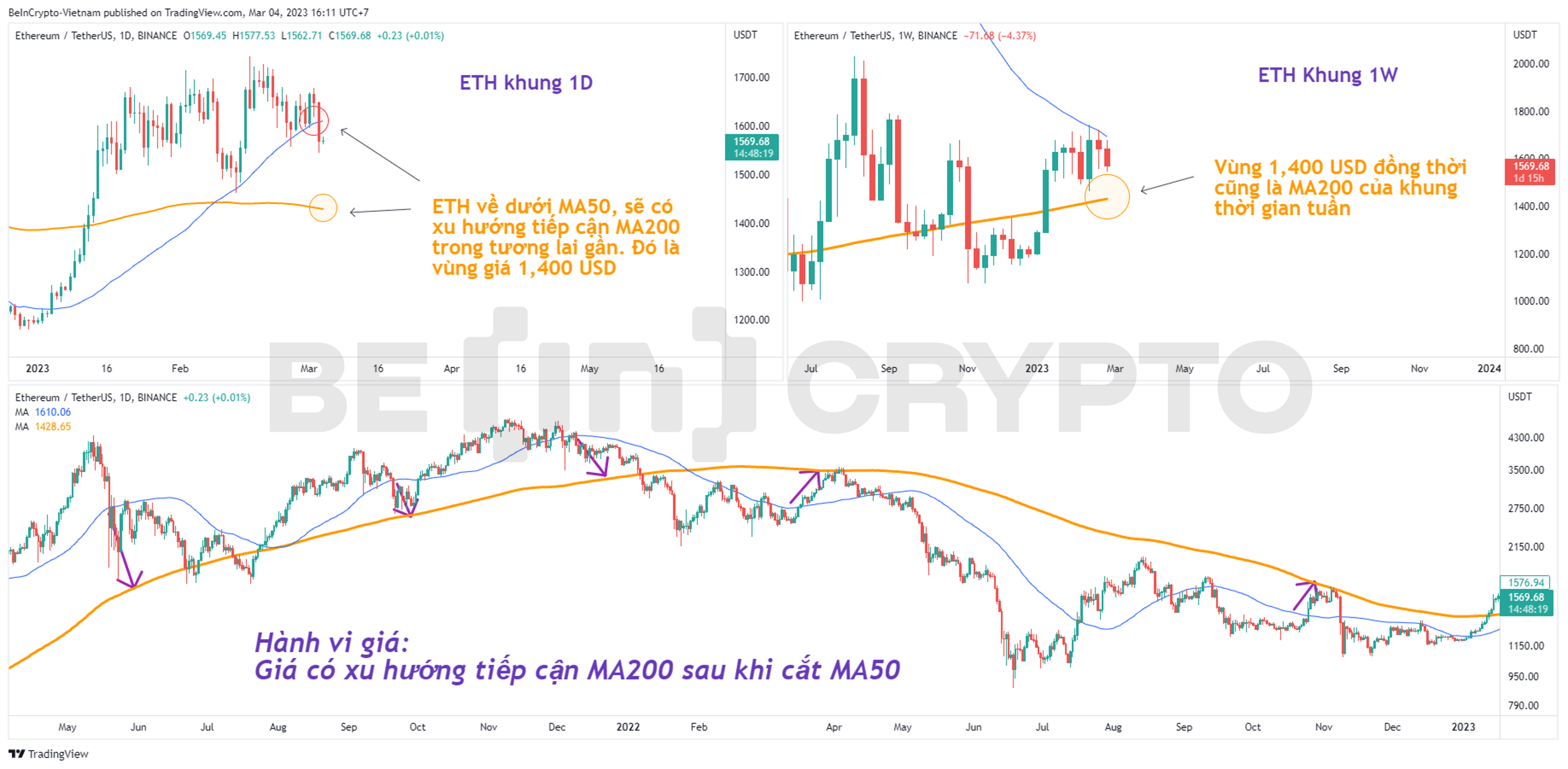 Sponsored- Đầu tiên, thói quan hành vi giá của ETH rất nhạy với MA50 và MA200. Nhiều lần trong quá khứ, giá ETH khi cắt MA50 sẽ có xu hướng tiếp cận MA200 trong tương lai gần.