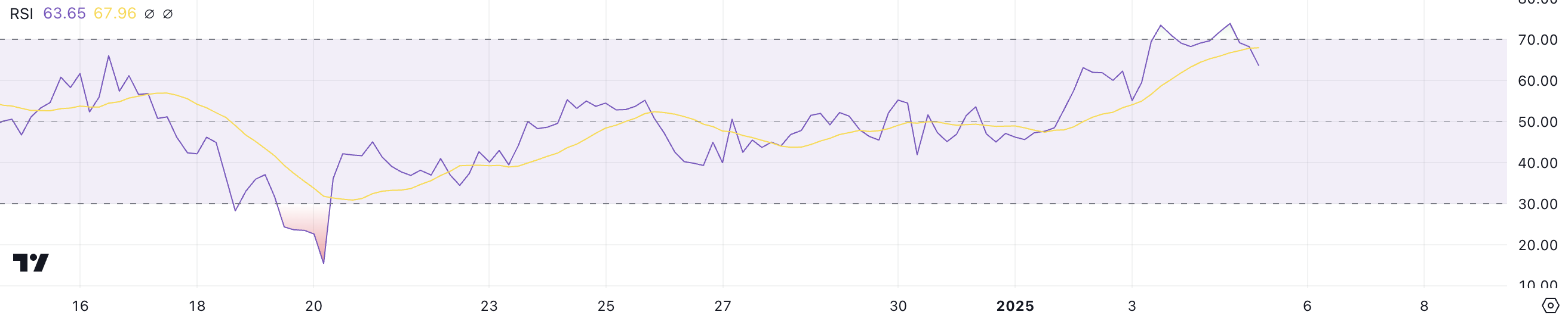 Chỉ số sức mạnh tương đối (RSI) của Ethereum hiện tại ở mức 63.6, sau khi vượt qua ngưỡng quá mua 70 trong khoảng thời gian từ ngày 03/01 đến ngày 04/01. RSI đo lường tốc độ và độ lớn của biến động giá trên thang điểm từ 0 đến 100, cung cấp cái nhìn sâu sắc về động lực thị trường.