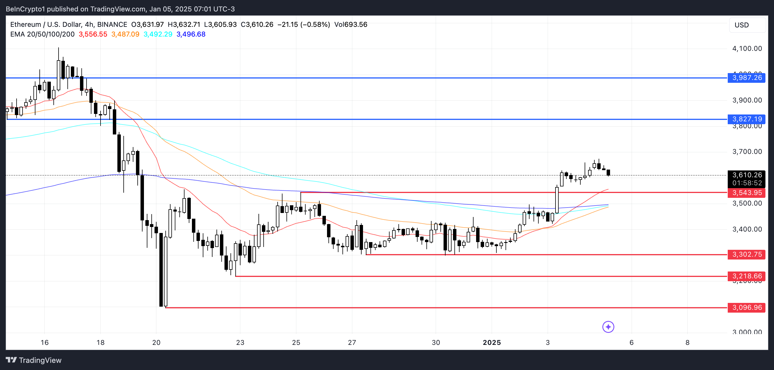 Giá Ethereum gần đây đã hình thành một “golden cross” vào ngày 04/01, một tín hiệu tăng giá xảy ra khi EMA ngắn hạn vượt qua EMA dài hạn. Mặc dù giá ETH chưa thấy sự tăng đáng kể sau sự hình thành này, nhưng thiết lập kỹ thuật cho thấy tiềm năng đà tăng.