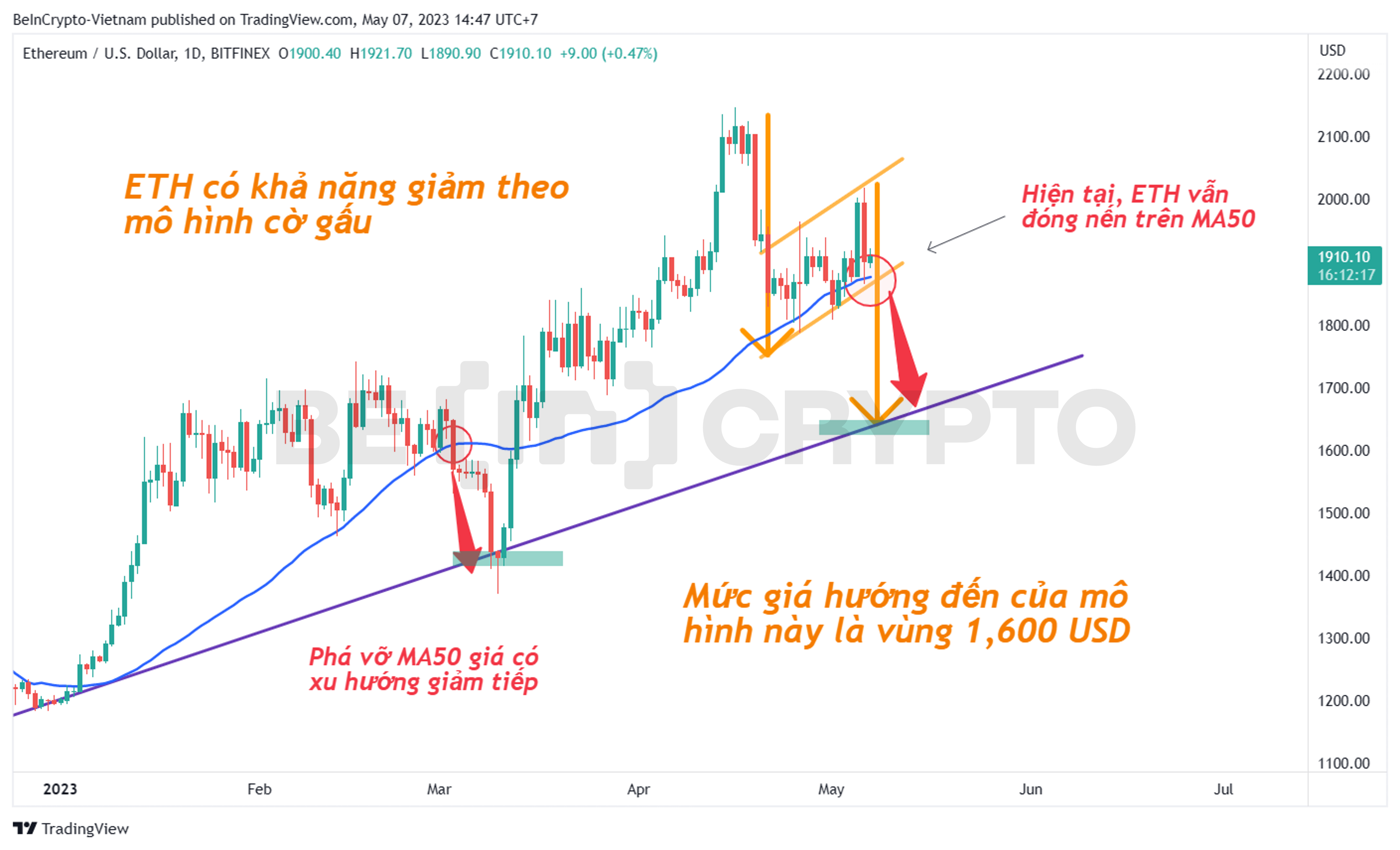 - Tuy nhiên, cấu trúc giá từ đầu năm 2023 đến nay thể hiện một điều kiện quan trọng cho kịch bản trên. Đó là giá ETH cần ít nhất là đóng nến ngày dưới MA50. Suốt 4 tháng qua, ETH mỗi lần điều chỉnh đều chạm MA50 rồi tăng tiếp. Nếu lần này lực bán quá mạnh khiến MA50 bị phá vỡ thì khả năng hoàn thành mô hình cờ gấu trong tháng 5 sẽ cao hơn.