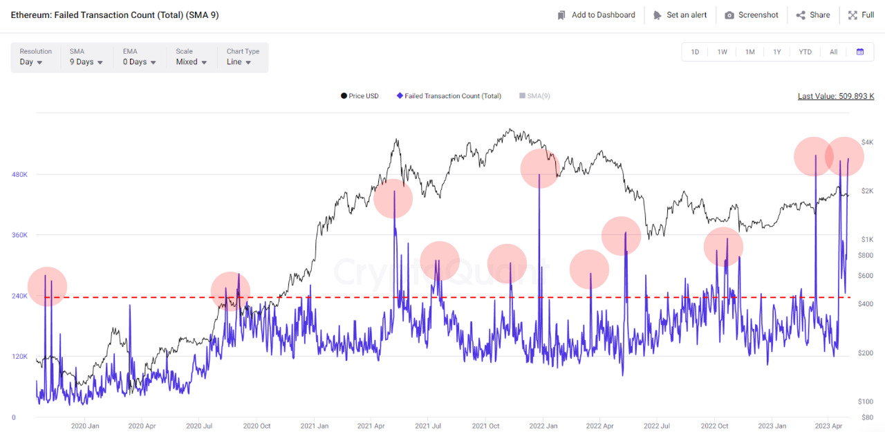- Những ngày đầu tháng 5 ghi nhận có ngày có đến 480,000 giao dịch ETH bị thất bại. Hoạt động này đặt mạng lưới ETH vào một phép thử sau một loạt các nâng cấp trong năm qua. Có thể thấy, phí GAS trung bình đang tăng cao hơn gần đây. Người giao dịch phải trả phí nhiều hơn để giao dịch được thành công.