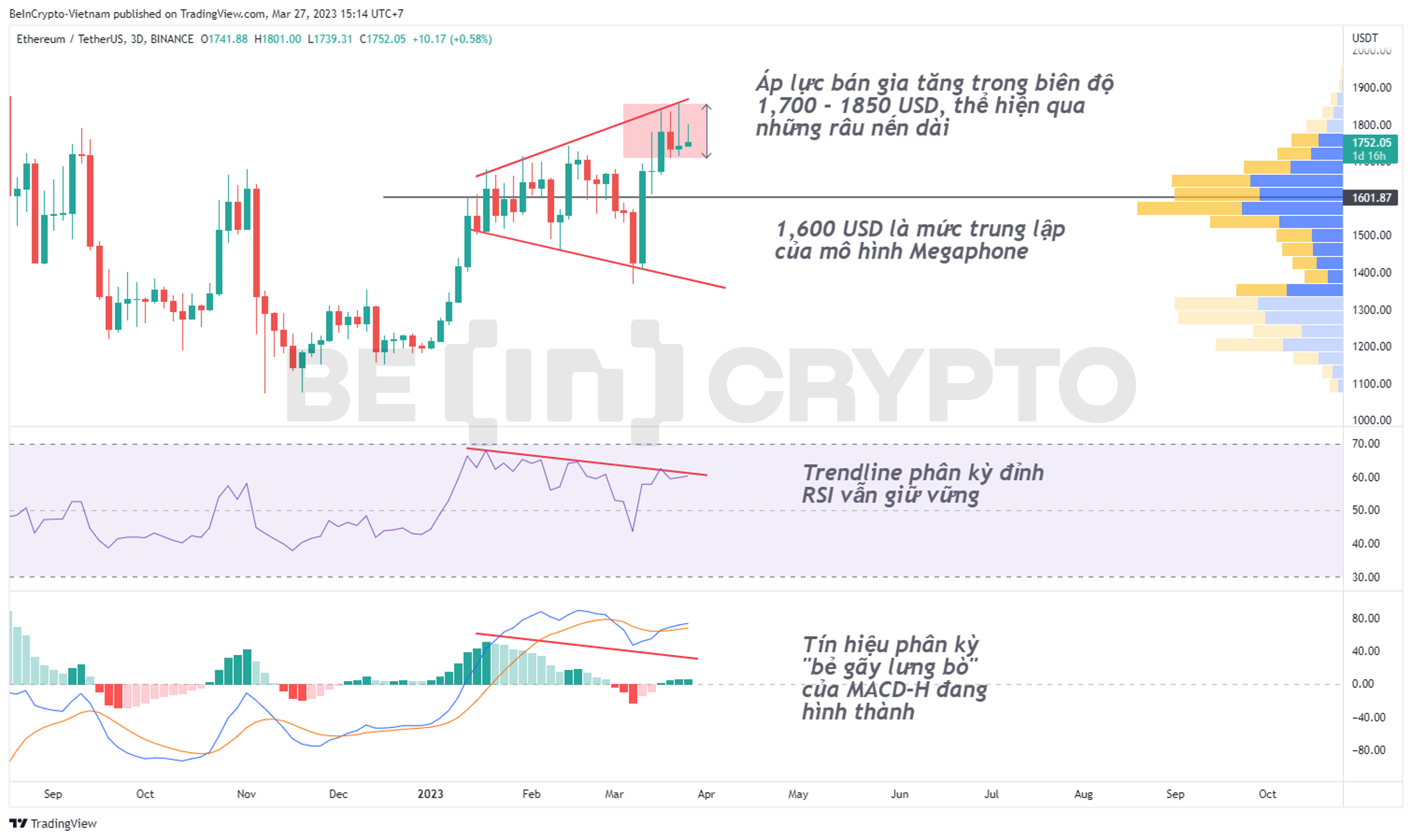 - Dù đã đóng nến trên 1,700 USD như phân tích trước, nhưng giá ETH vẫn không đủ lực mua để tăng tiếp đến 2,000 USD. Thay vào đó, ETH bị giữ lại trong mô hình Megaphone. Áp lực bán thể hiện rõ rệt qua những râu nến khung 3 ngày (3D).