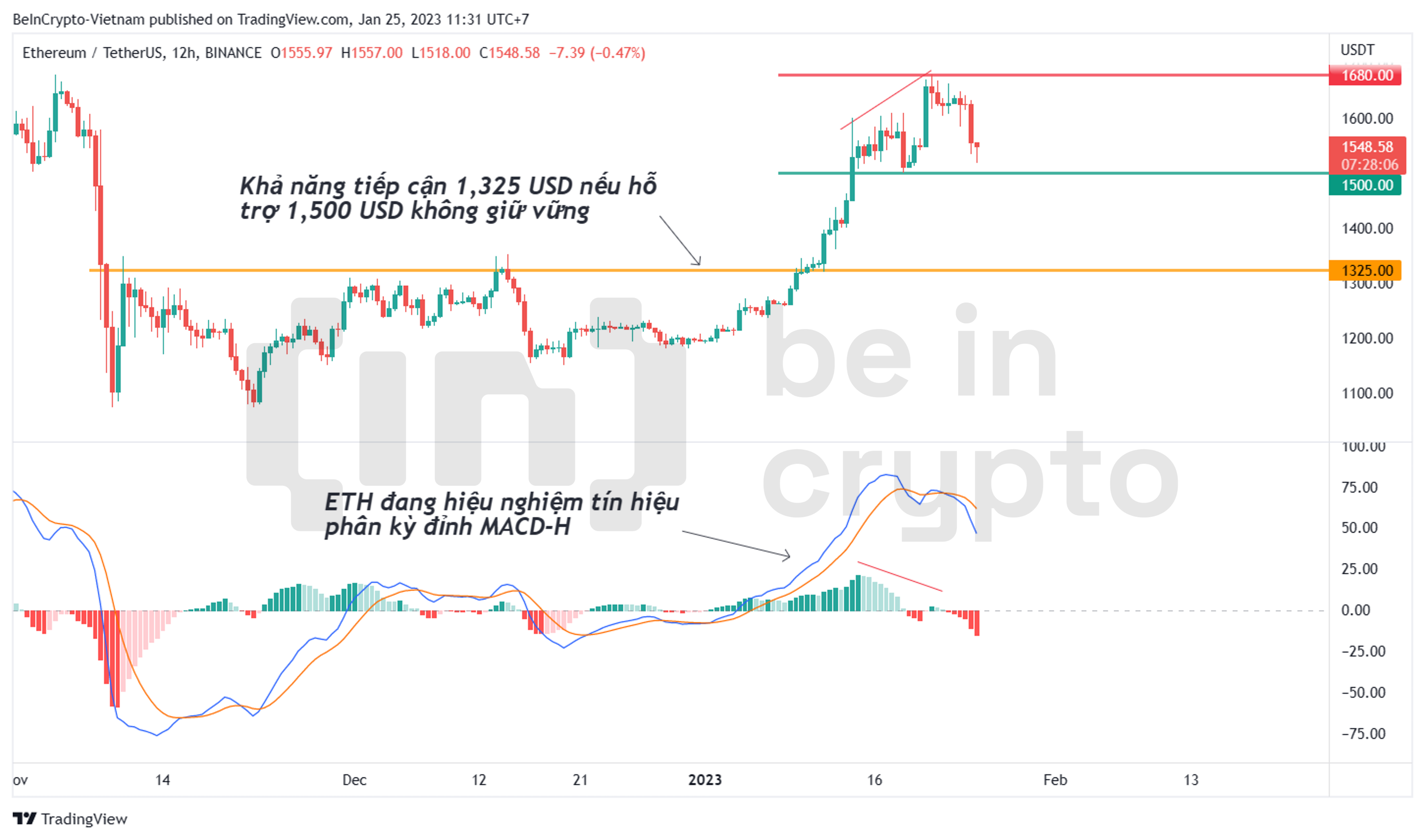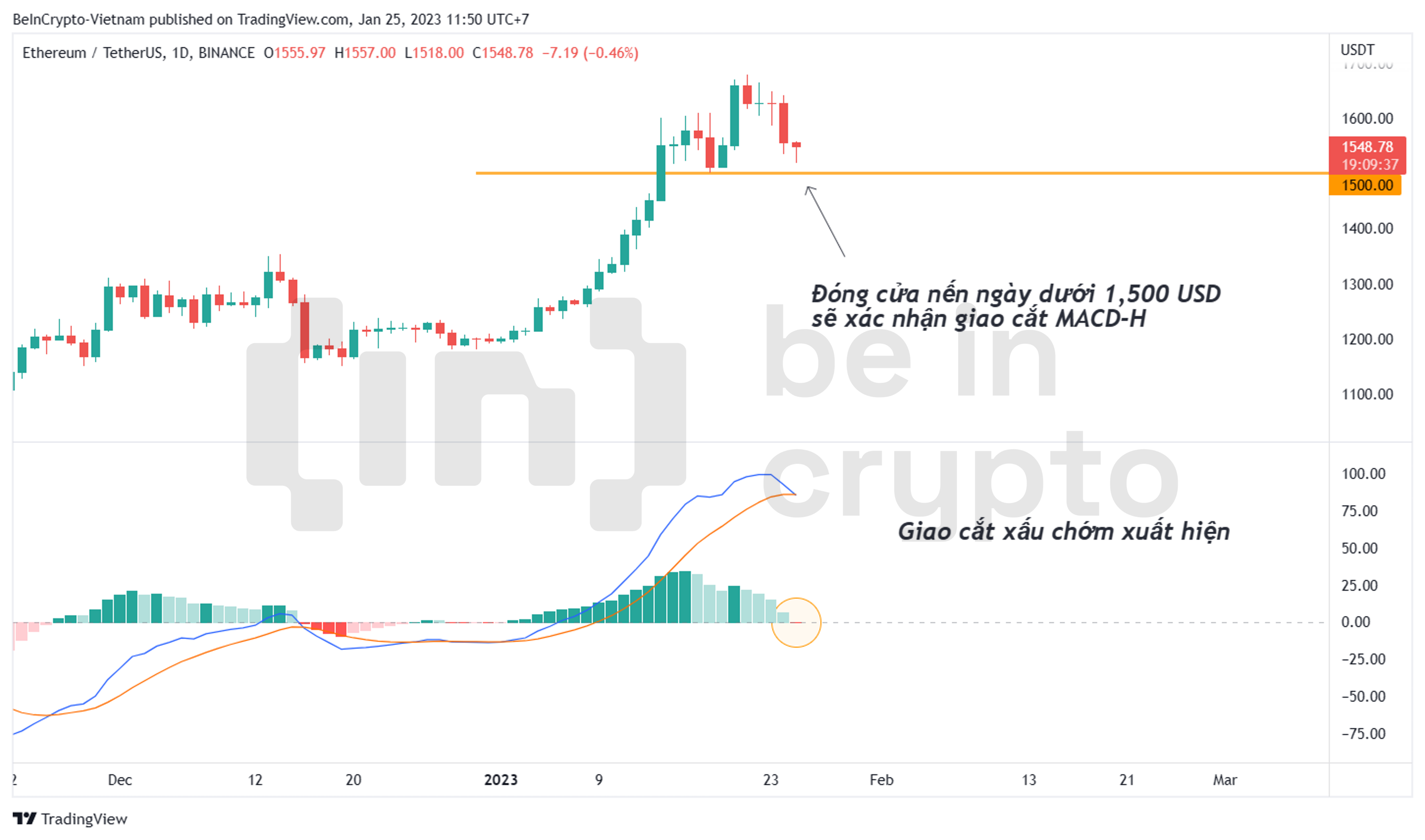 - Tuy nhiên, nếu ETH đóng cửa hôm nay dưới 1,500 USD, thì giao cắt xấu giữa MACD Line và Signal Line cũng chính thức được xác nhận. Các nhà giao dịch ngắn hạn nên thoát vị thế trước đó hoặc đứng ngoài thị trường.