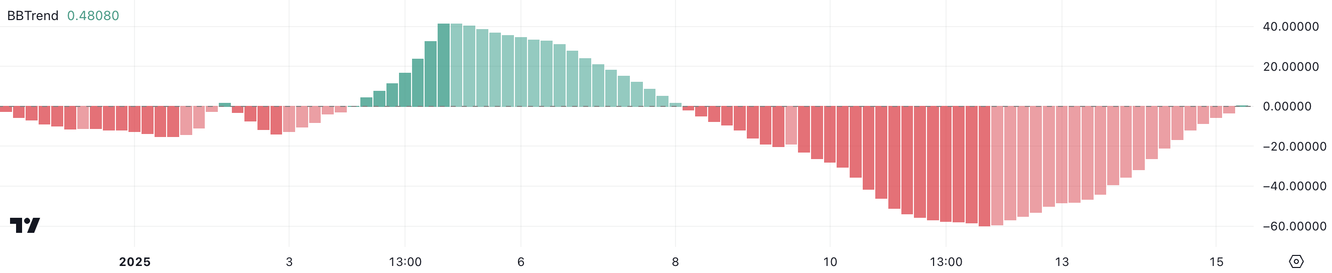 Chỉ số BBTrend hiện đang ở mức 0.48, chuyển sang tích cực lần đầu tiên kể từ ngày 08/01 sau khi đạt đỉnh tiêu cực -59.9 vào ngày 12/01. Sự chuyển đổi này sang vùng tích cực báo hiệu sự chuyển đổi từ điều kiện giảm giá sang tăng giá, cho thấy tâm lý thị trường cải thiện khi các đồng meme phục hồi sau những điều chỉnh gần đây.